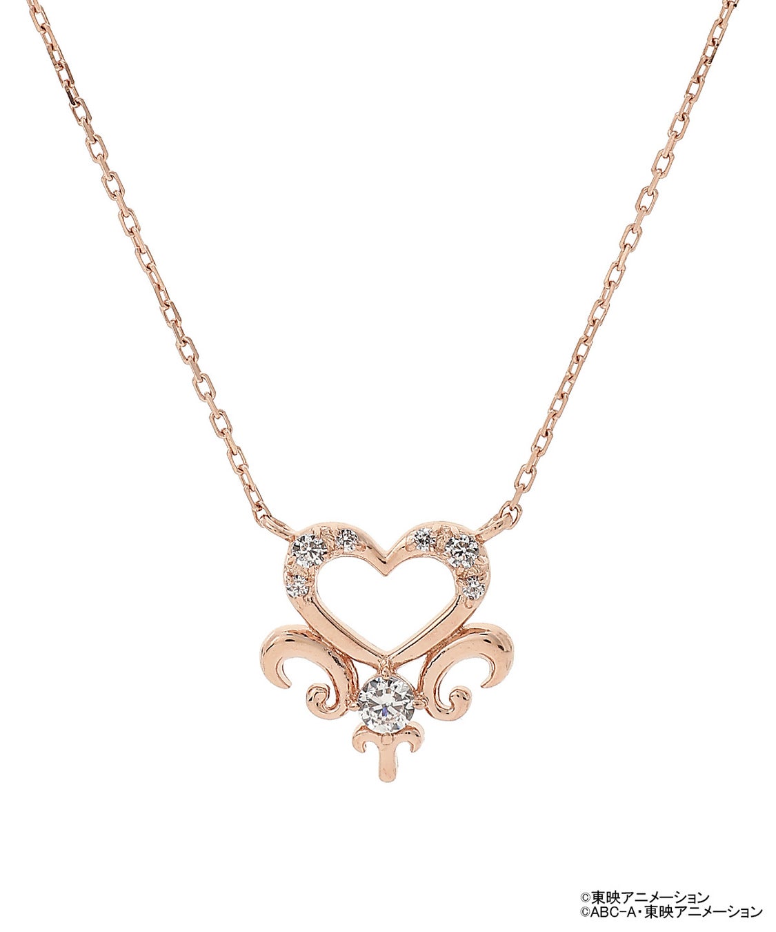 ピンクゴールドの優しい色味に、クリアストーンがきらりと輝くデザインです。プリキュアの世界観をいつも胸につけていただけます。