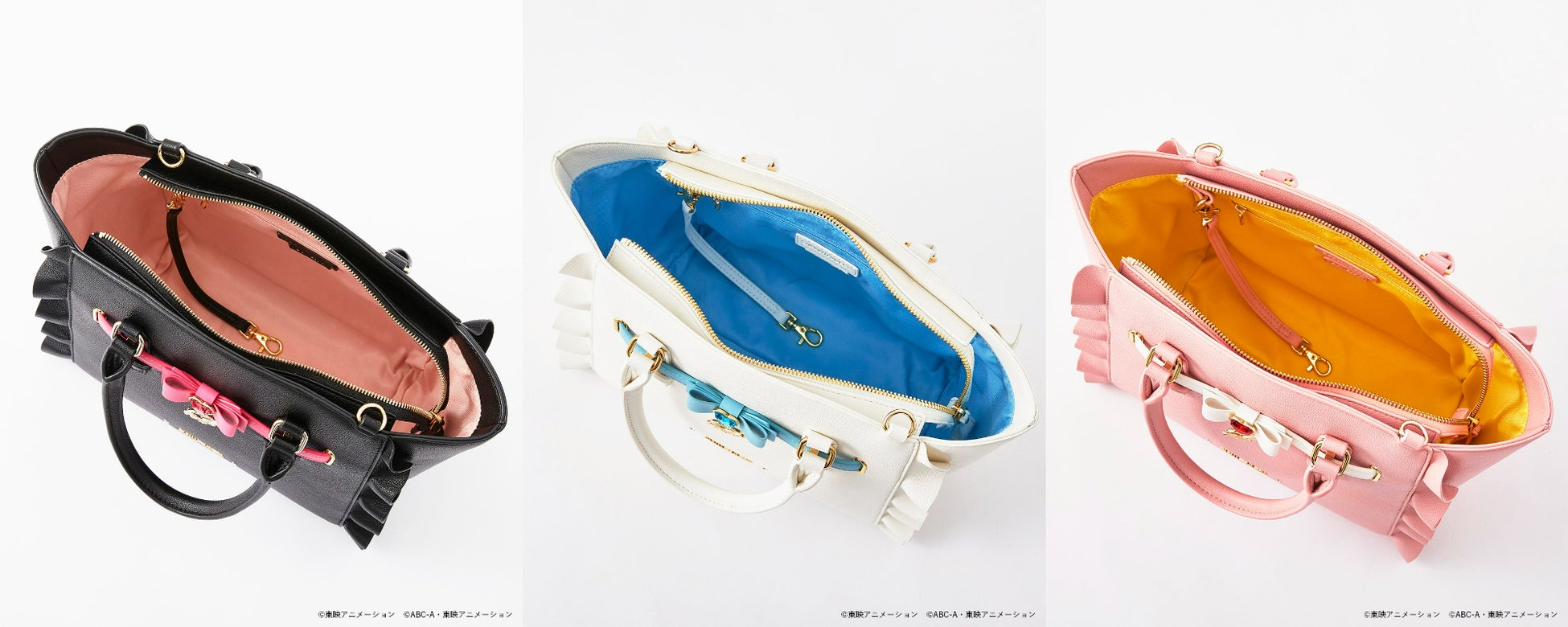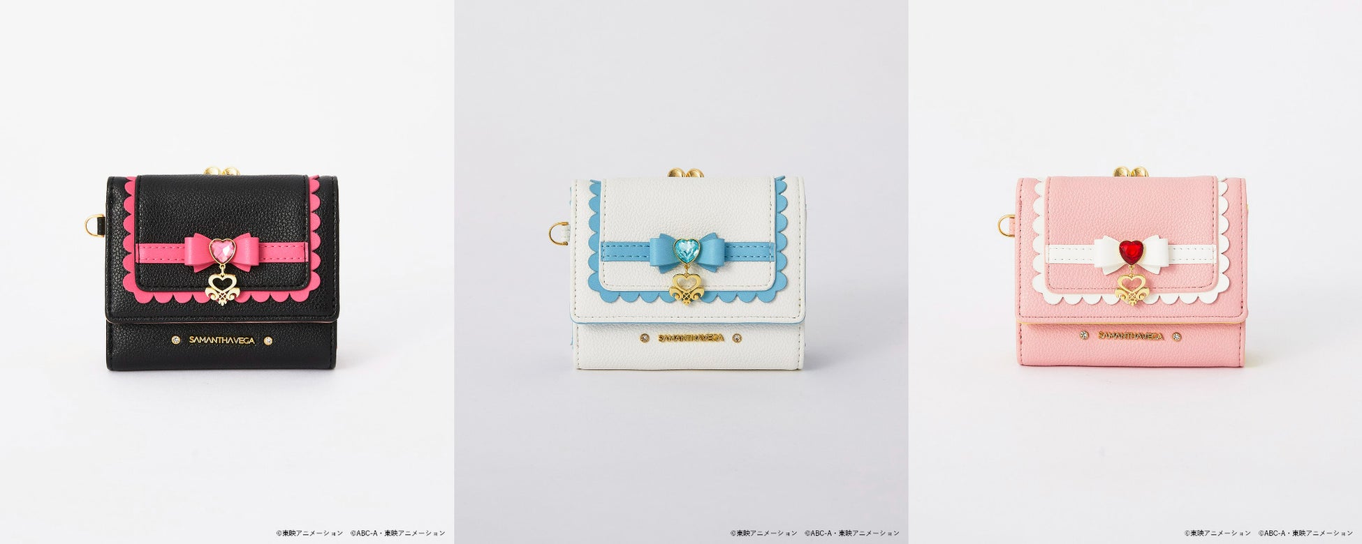「SAMANTHAVEGA(サマンサベガ)」のラインナップは、「キュアブラック」、「キュアホワイト」、「シャイニールミナス」をイメージしたハンドバッグ、折財布や、ミップル、メップル、ポルンをイメージしたチャームなど全9種です。