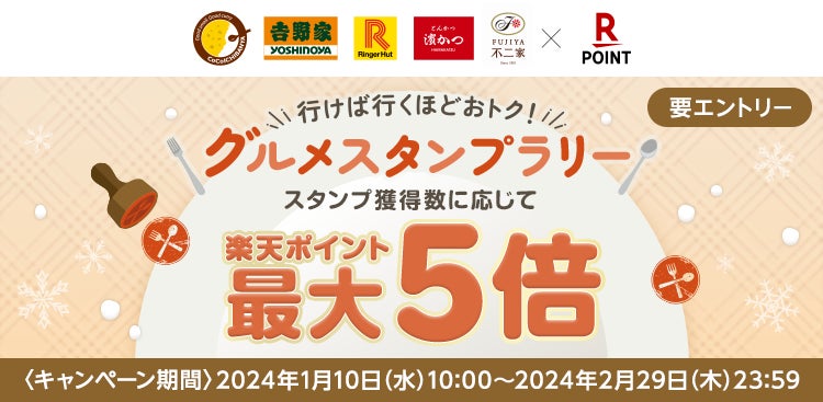 楽天ペイメント株式会社(以下「楽天ペイメント」)は、共通ポイントサービス「楽天ポイントカード」において、飲食に関連する加盟店が参画する「行けば行くほどおトク!グルメスタンプラリー」を2024年1月10日(水)から2月29日(木)まで実施します。