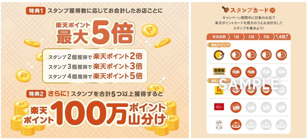 【特典1】 各対象店舗で「楽天ポイントカード」を提示して1ポイント以上獲得した来店回数に応じてスタンプを最大4つ進呈します。スタンプ獲得数に応じたポイント倍率にて「楽天ポイント」を進呈します。