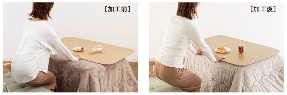 さらに、商品仕様もリニューアル。お客様からいただいた「天板やこたつ布団がずれてしまう」というお困り事の声をもとに、天板裏と中天板に特殊加工を施し、天板がずれにくい機能を新たに追加いたしました。