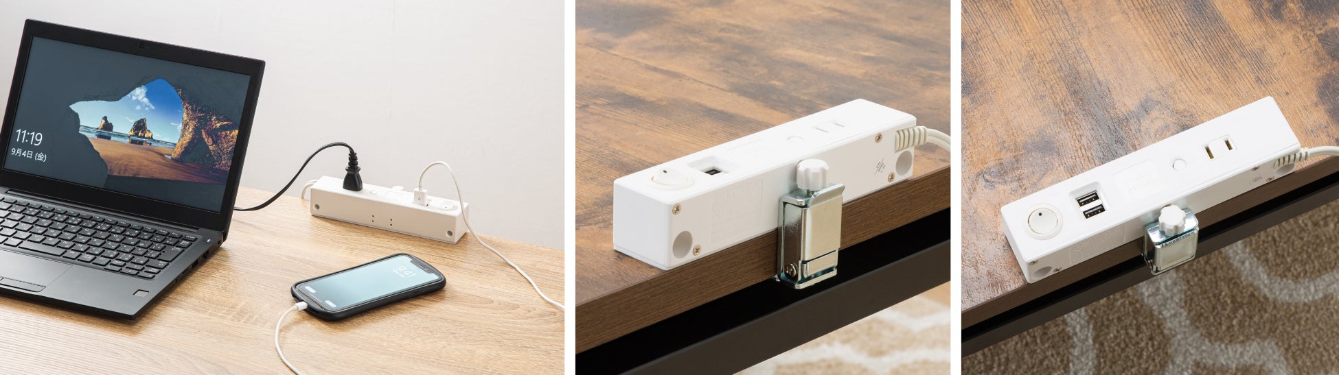 ACコンセント、USBポート2個口。天板の厚さ18cm~30㎝に対応しており、こたつのみならず、デスクやベッドフレームなどの様々な箇所に取り付けてご使用いただけます。工具不要で簡単に取り付けが可能です。