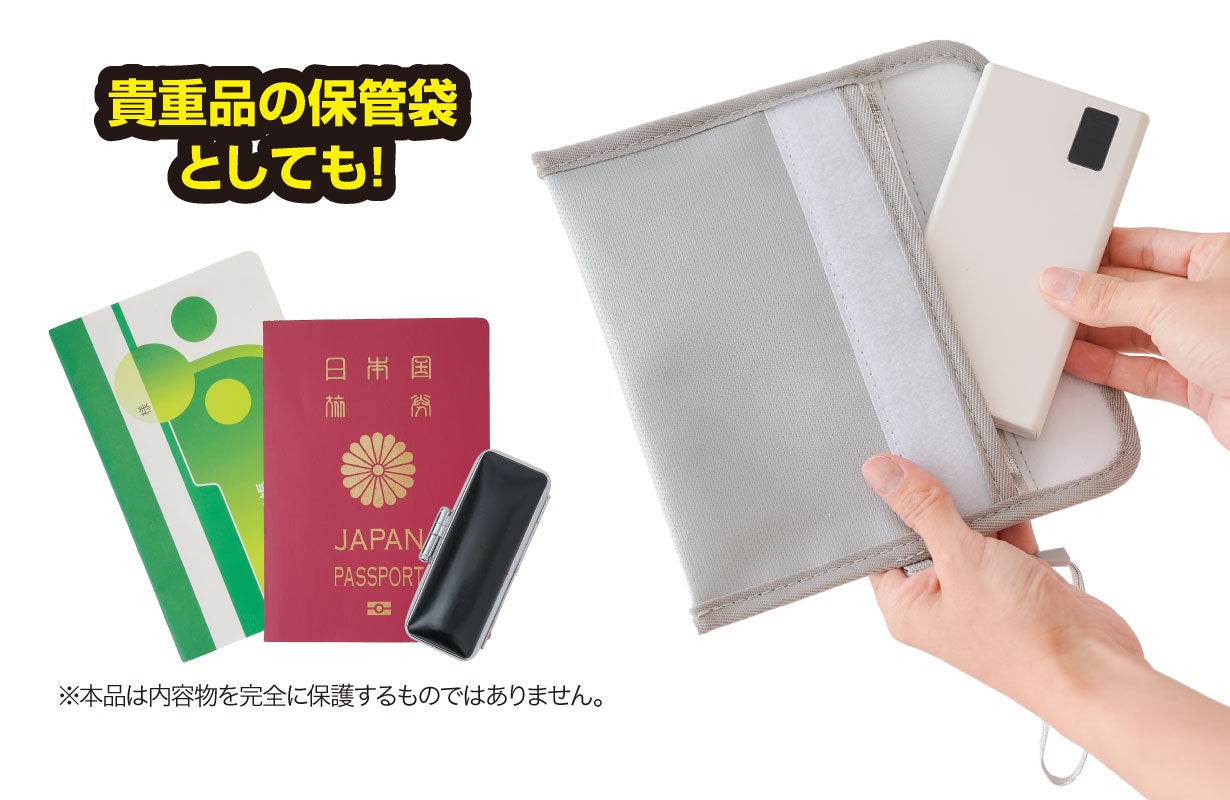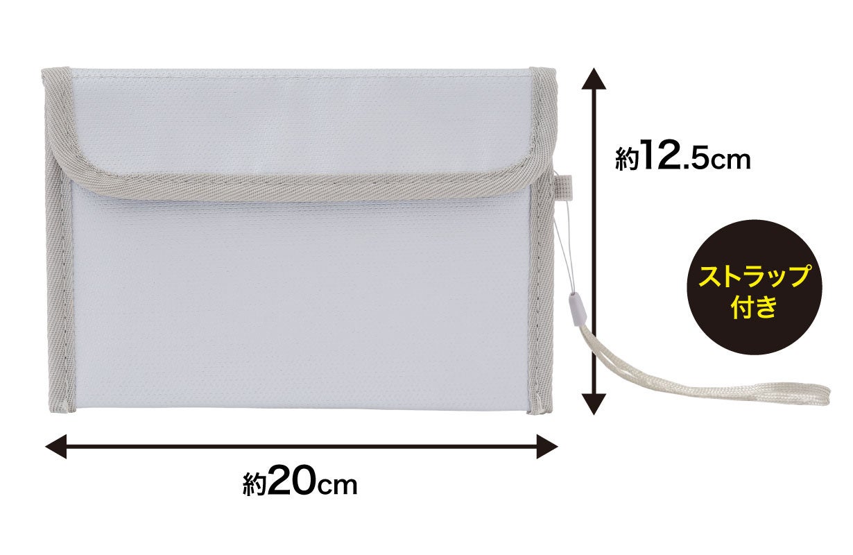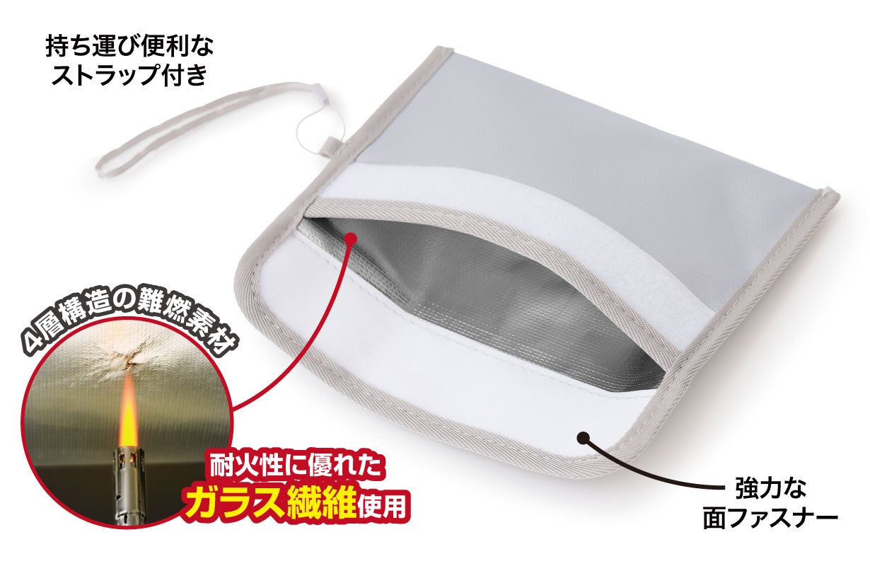 耐火性に優れたガラス繊維を使用した4層構造!難燃素材でもしもに備えよう!強力な面ファスナーで移動中もしっかり閉まる!ちょうどいい持ち運びに便利な“コンパクトサイズ”ストラップ付きで便利さUP!