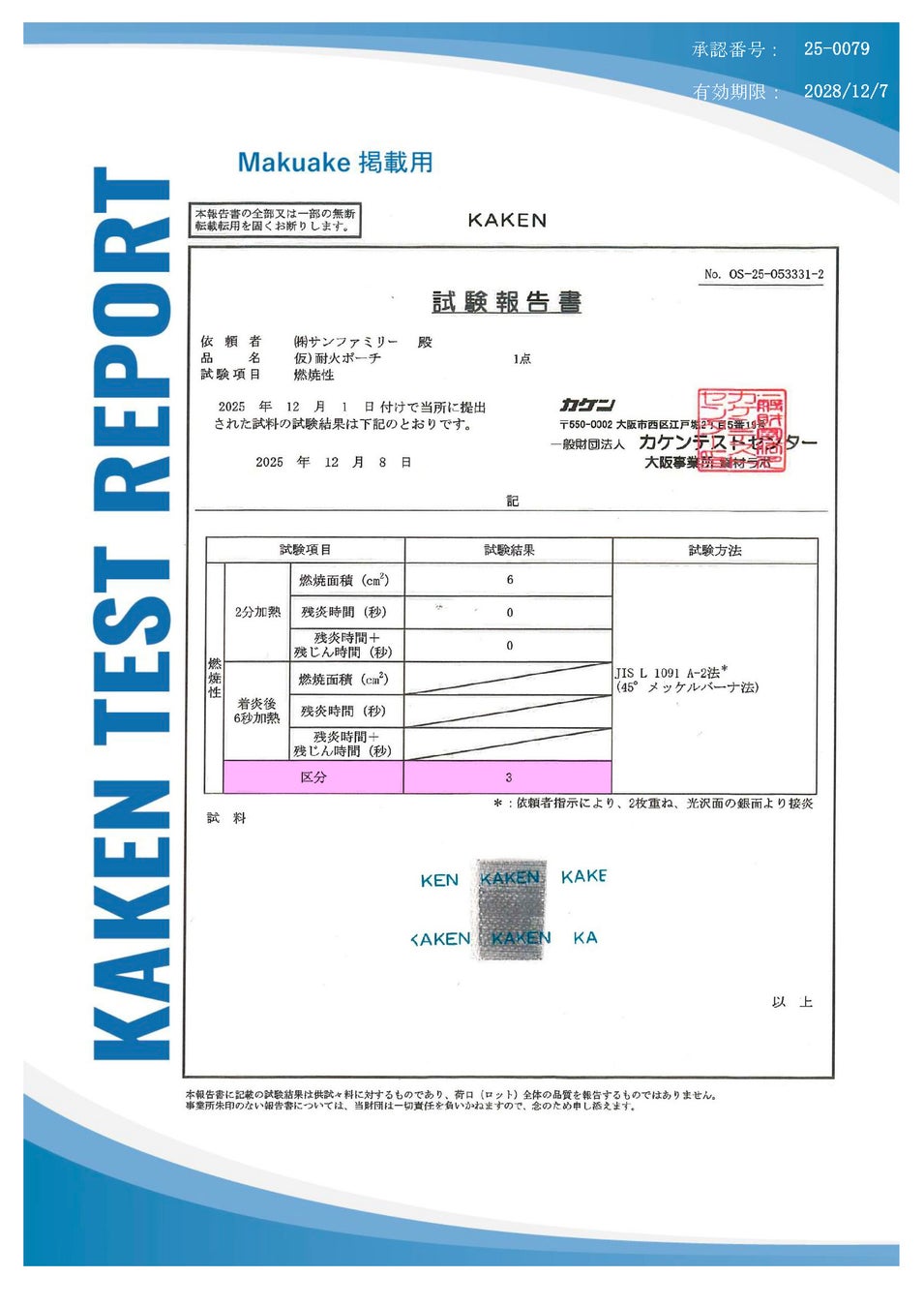 ・素材について第三者機関(一般財団法人カケンテストセンター)で別途試験し、