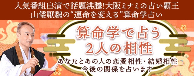 大阪ミナミの占い覇王として数々の番組やメディアで人気を博している山倭厭魏(やまとおうぎ)による本格算命学サイト『山倭厭魏の算命学』にて、この度『算命学で占う2人の相性』を無料公開いたしました。生年月日を入力するだけで、気になる相手との恋愛相性・結婚相性のみならず、相手が今あなたに抱いている本音や、今後の2人の関係まで詳細に鑑定することができます。運命を反転させて幸せへと導く、算命学による相性占いをどうぞお楽しみください。