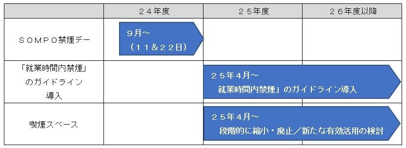 2024年9月以降、毎月11日(健康にいい日)と22日(スワンスワンデー/「吸わん吸わんの日」)をSOMPO禁煙デーと称し、就業時間内禁煙の試行実施期間を設けます。