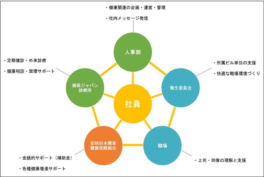 実施にあたっては、安田日本興亜健康保険組合との連携をはじめ、企業内診療所(損保ジャパン診療所)や各職場の衛生委員会等を通じて禁煙希望者に対する丁寧な禁煙サポートを行います。(参考2、3)