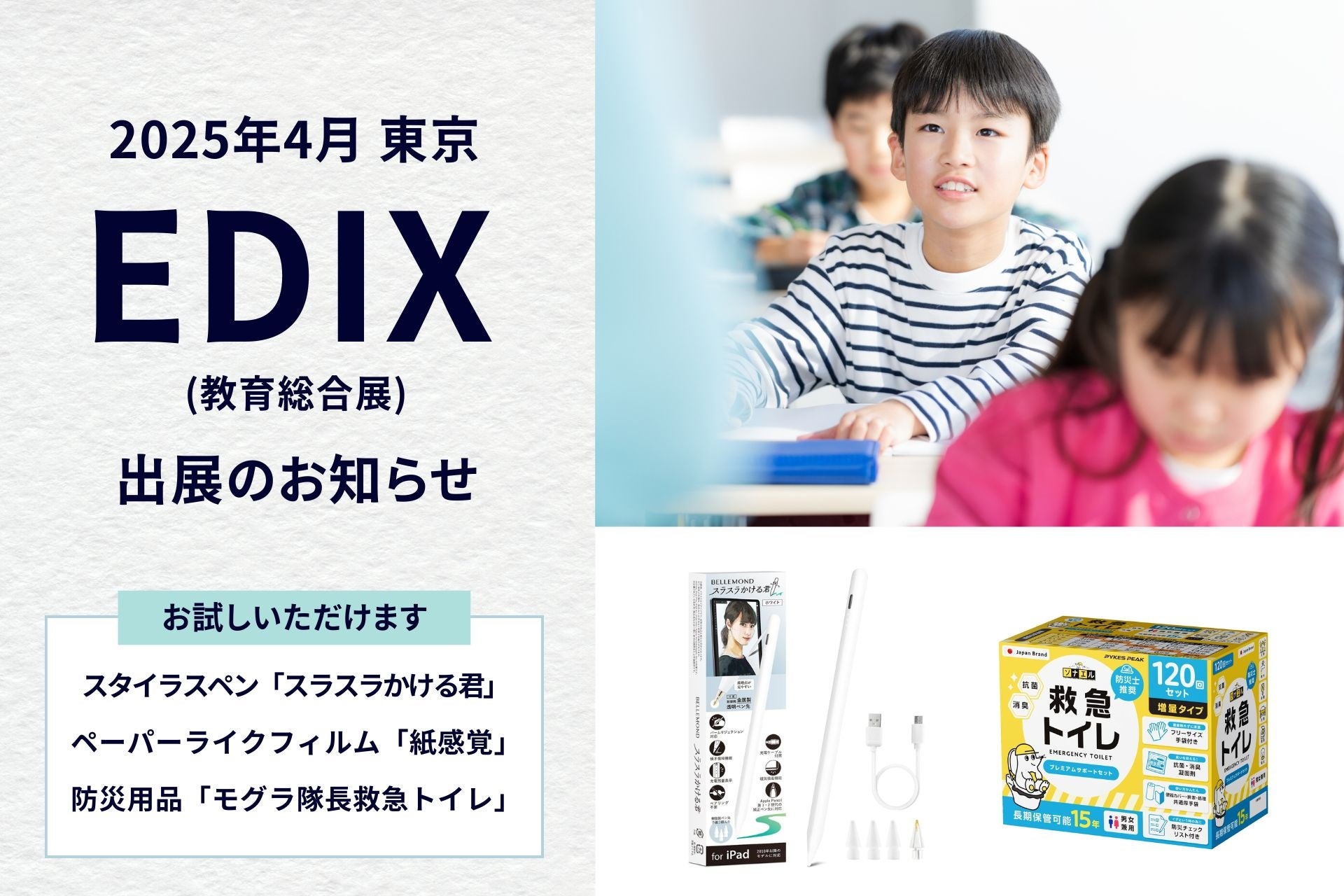 【出展のお知らせ】タッチペン「スラスラかける君」や画面保護フィルム等タブレット関連製品・防災用品「モグラ隊長の救急トイレ」を展示!第16回「EDIX(教育総合展)東京」(4月23日~25日)