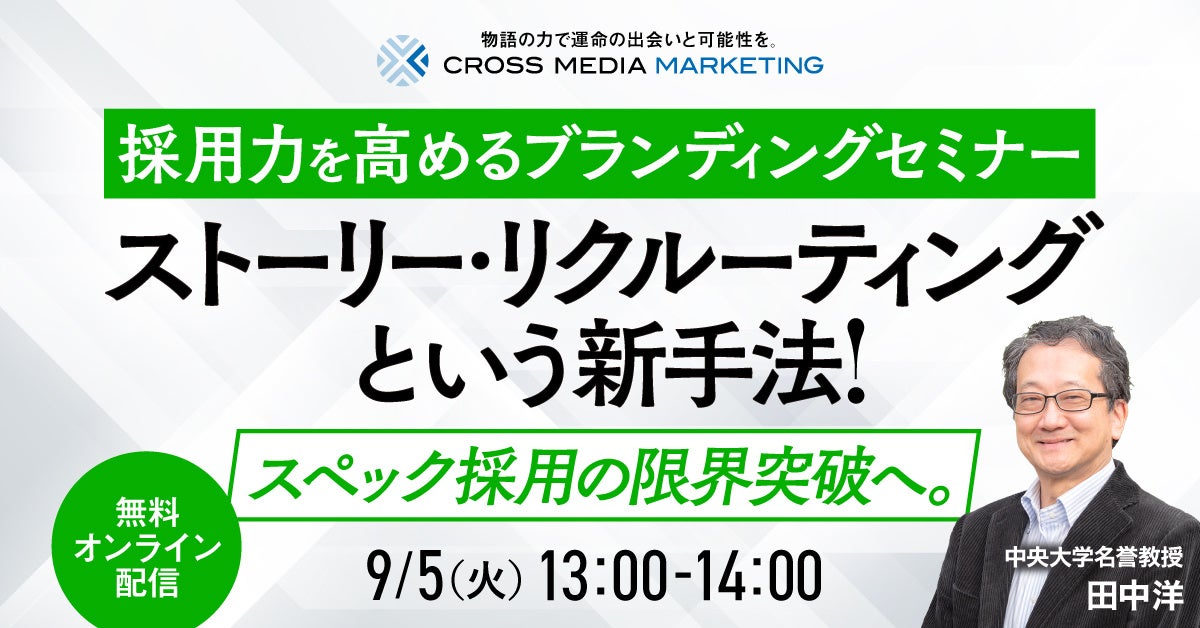 本セミナーでは、採用力を高めるストーリー・リクルーティングの概要をお話します。話し手は中央大学名誉教授の田中洋氏で、ブランド戦略論の専門家として、採用力を高めるブランドの質を高める考え方と手法についてお話いただきます。