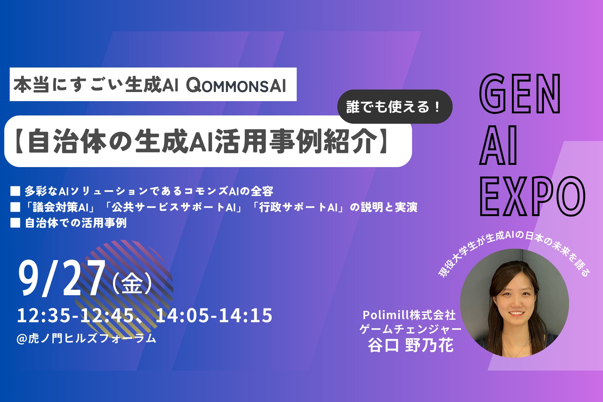 セミナー:多くの自治体・省庁が導入している本当にすごい生成AI「QommonsAI(コモンズAI)」の実演(登壇:Polimill株式会社 ゲームチェンジャー 谷口野乃花)