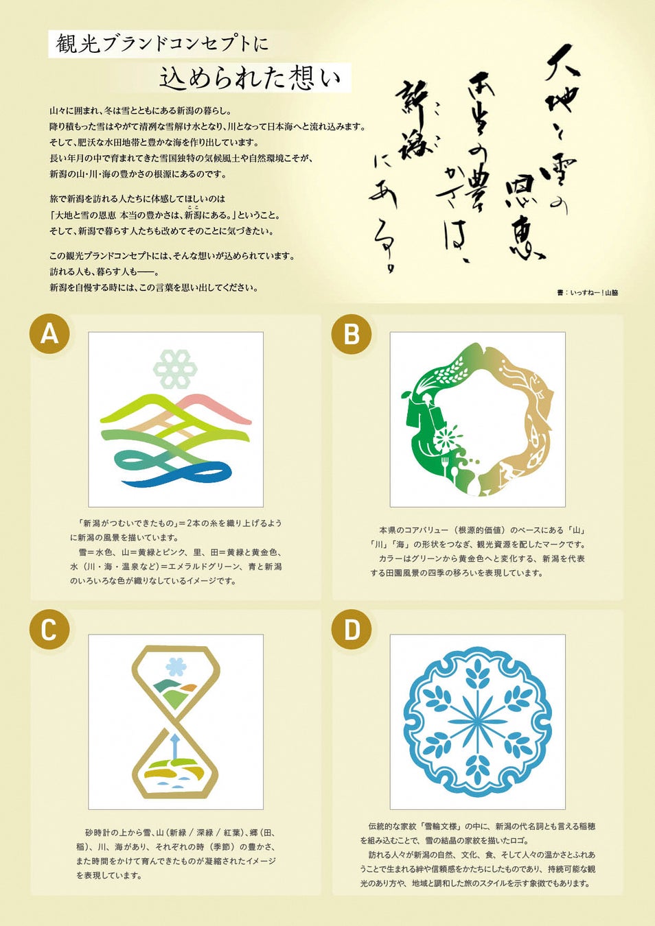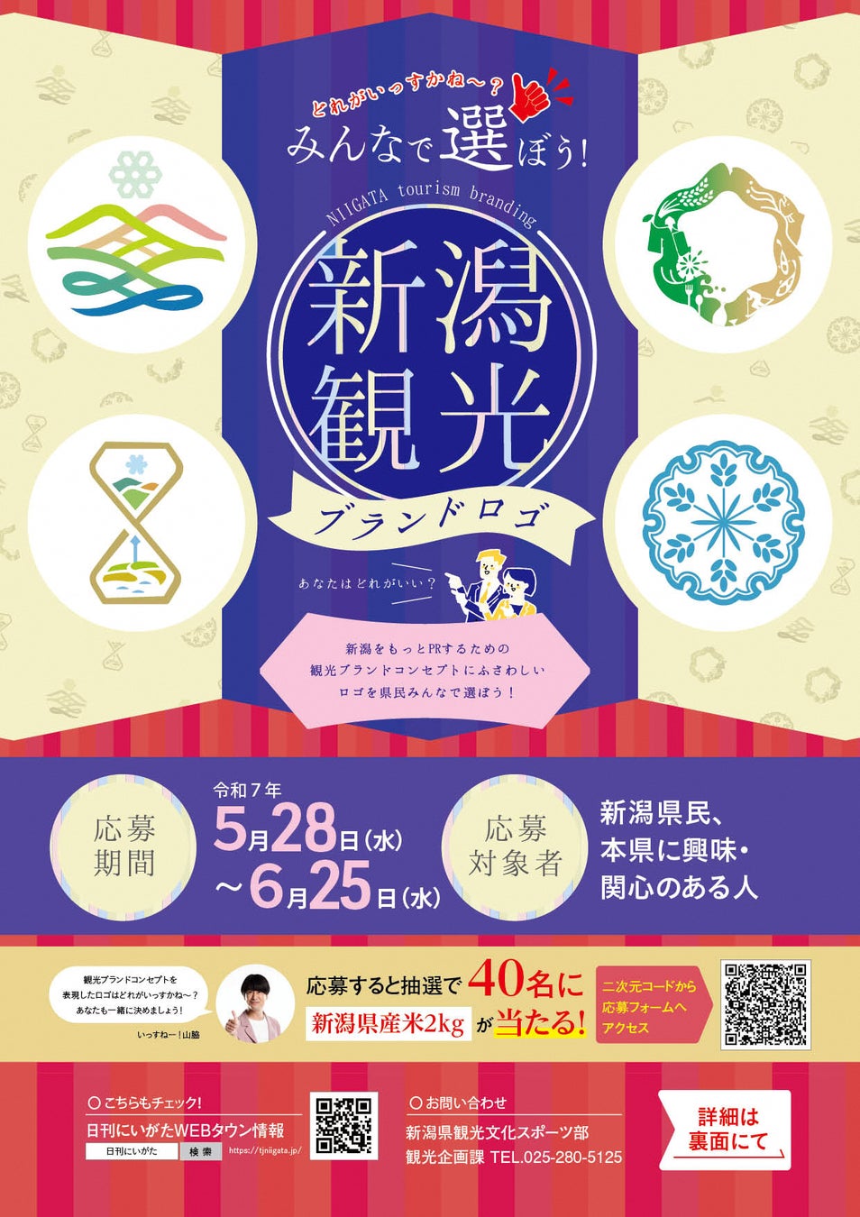 新潟県では、令和7年3月に改定した「新潟県観光立県推進行動計画」の中で、ブランドコ ンセプト(本県に来訪する旅行者が受け取る価値)を整理し、この度、本県観光ブ ランドの「顔」となり、県民や県内関係者が統一感をもって発信する基盤となるロゴマークの選定に向けて、皆さんからの投票を実施します。