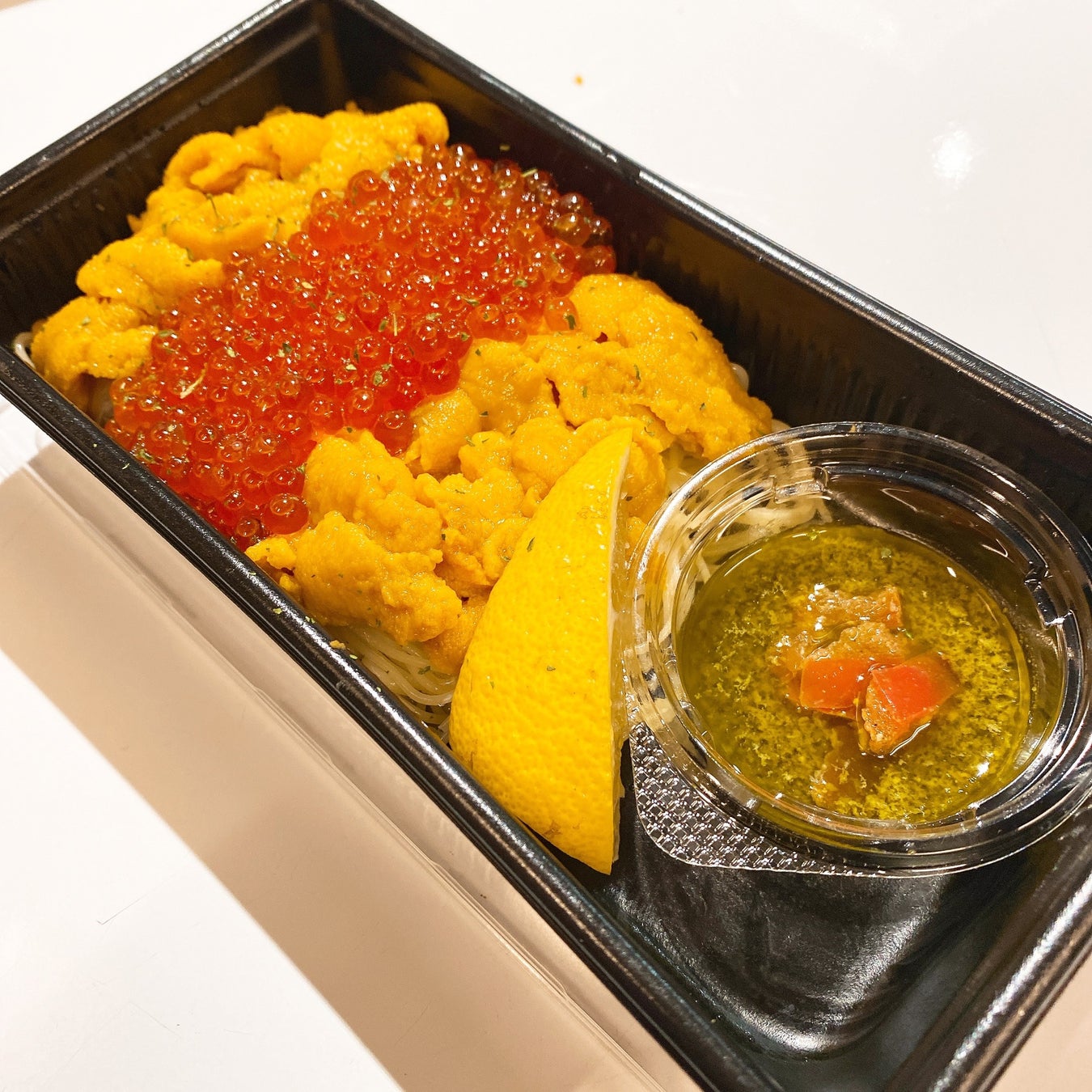「大衆酒場 フレンチマン」で不動の一番人気メニュー。パスタが見えないほど、うにとイクラをふんだんにのせた贅沢な一品です。