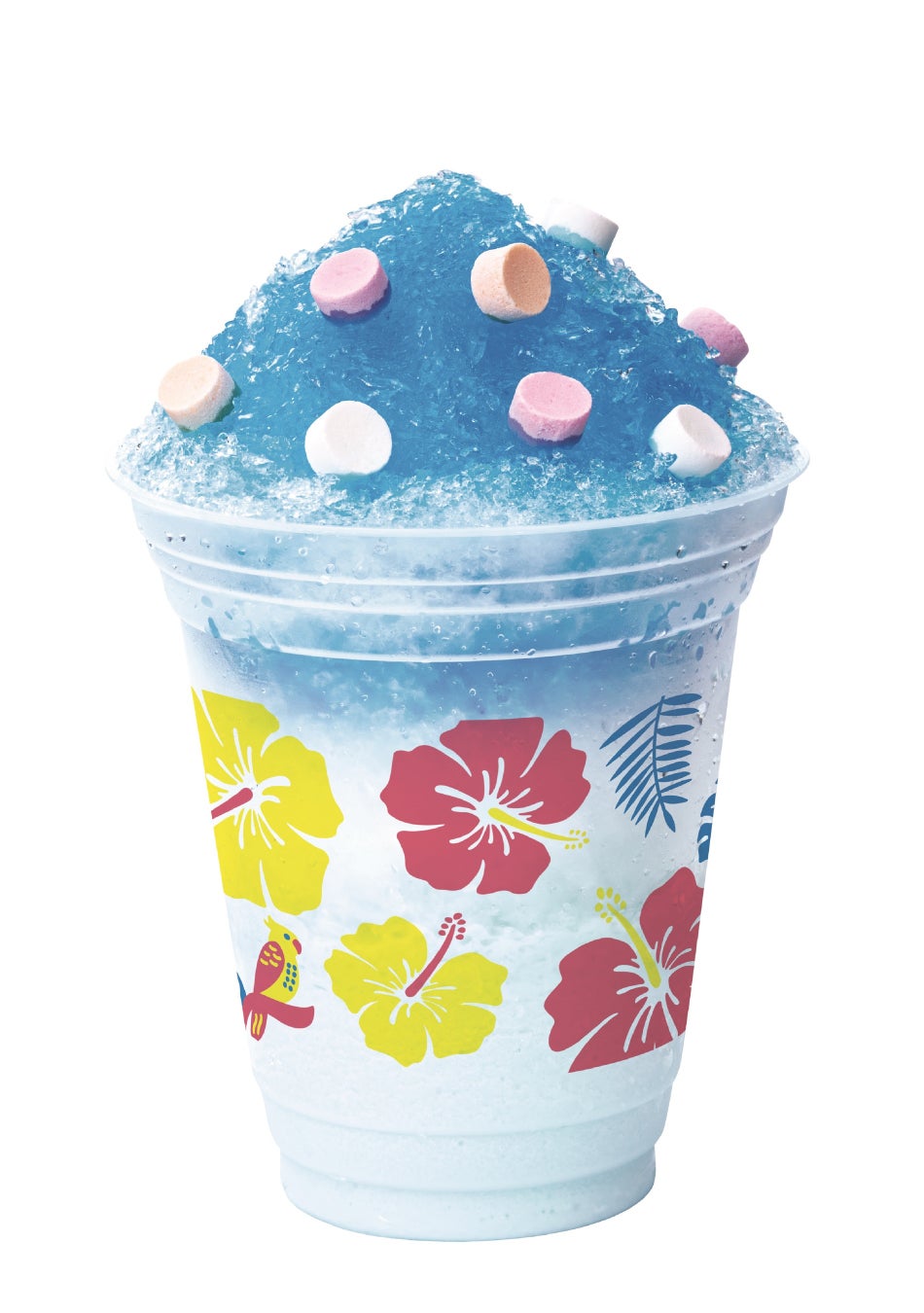 商品概要:ラムネフレーバーのシェーキに爽やかなブルーハワイかき氷を組み合わせ、ラムネをトッピングしました。