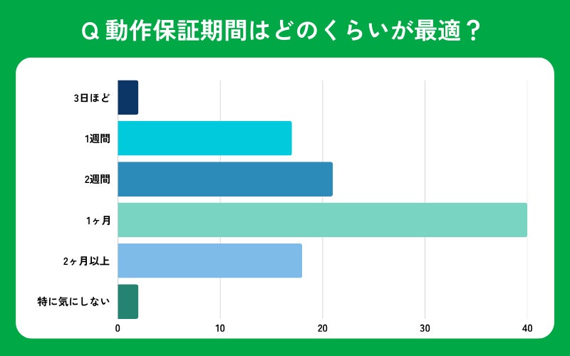 アフターケアで求められる内容は「仕上がりに不満時の再対応」「動作保証期間」で、動作保証期間については1ヶ月ほどの期間が求められている。