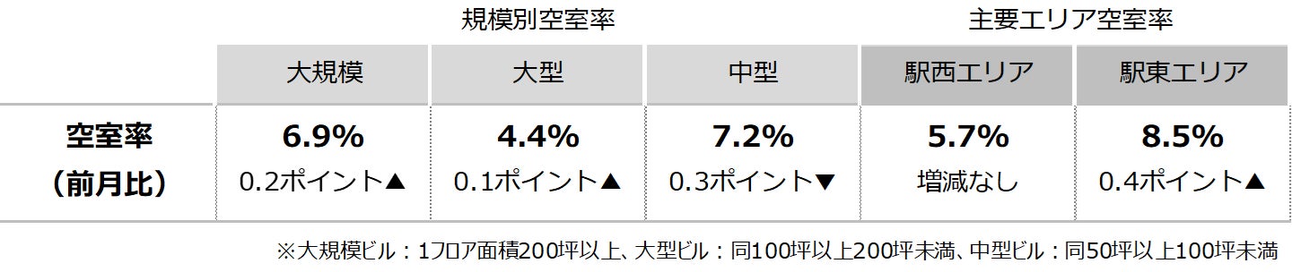 空室率は前月比プラス0.06ポイントの6.35%となり、前月から小幅に上昇した。新築ビルに移転したテナントの二次空室や集約移転等により現空床が生じている。潜在空室率は前月比マイナス0.10ポイントの7.52%だった。