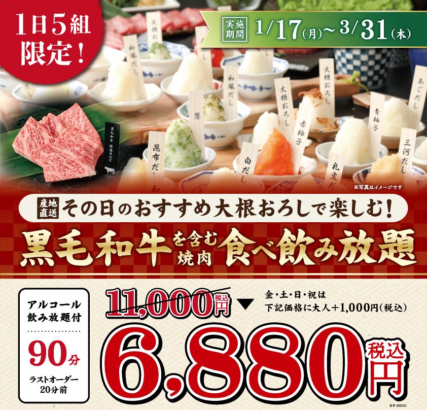 【国産食材を食べて応援!】「焼肉X牛」の三浦半島産大根おろしと共に楽しむ焼肉食べ放題(アルコール飲み放題付)1日5組限定、通常価格お一人様11,000円が6,880円に!