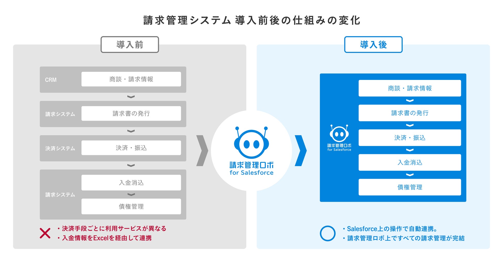 この課題を解決するため、この度「請求管理ロボ for Salesforce」を導入いただきました。本導入により、Salesforce®上の顧客・契約情報と完全に連携し、段階的にあらゆる決済手段・請求管理業務をSalesforce®上に集約し、自動化していきます。これにより、ダイニー社の経理部門はノンコア業務から解放され、事業成長に直結する、より戦略的な業務へのシフトを実現します。