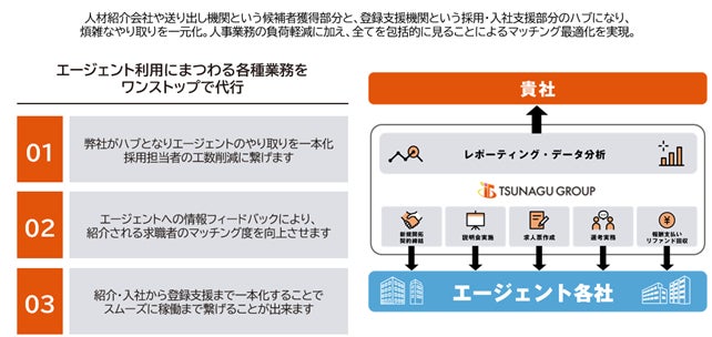 RPO(採用業務代行)・採用コンサルティングを行う株式会社ツナググループ・ホールディングス(本社:東京都中央区、代表取締役社長:米田光宏、以下「ツナググループ」)は、日本の社会課題である2030年約50億時間の労働需給ギャップ解消に向け、外国人材の採用から活躍するまでの土台をトータル支援する人材紹介サービス「Global Agent Next」を開始しました。多彩なパートナー企業と連携し、人材要件に合わせた在留資格のアドバイスや採用ターゲット設定といった初期設計から入社するまでの複雑な手続き、入社後のサポートまで万全に対応し、企業の採用課題を根本から解決します。