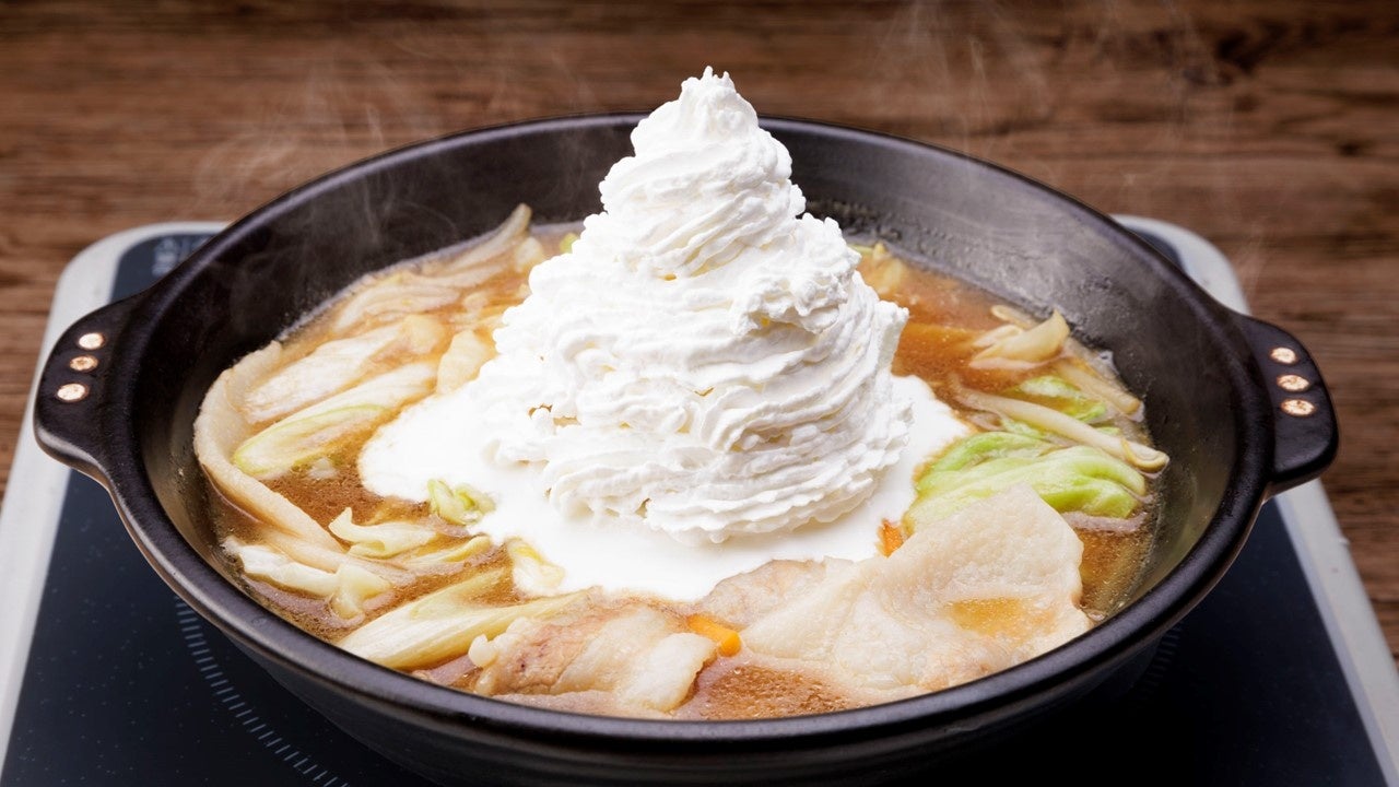 1⼈⽤鍋つゆを使って、おひとり鍋パ! 野菜を全部投⼊した上に、⽣クリームをトッピング。 意外にもマイルドなおいしさになります。