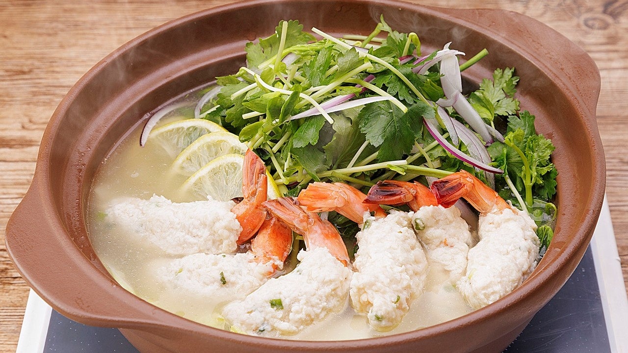 えびと鶏のひき肉で作った団子がボリューム満点!豆苗や三つ葉をたっぷり使用したあっさり風味の鍋です。