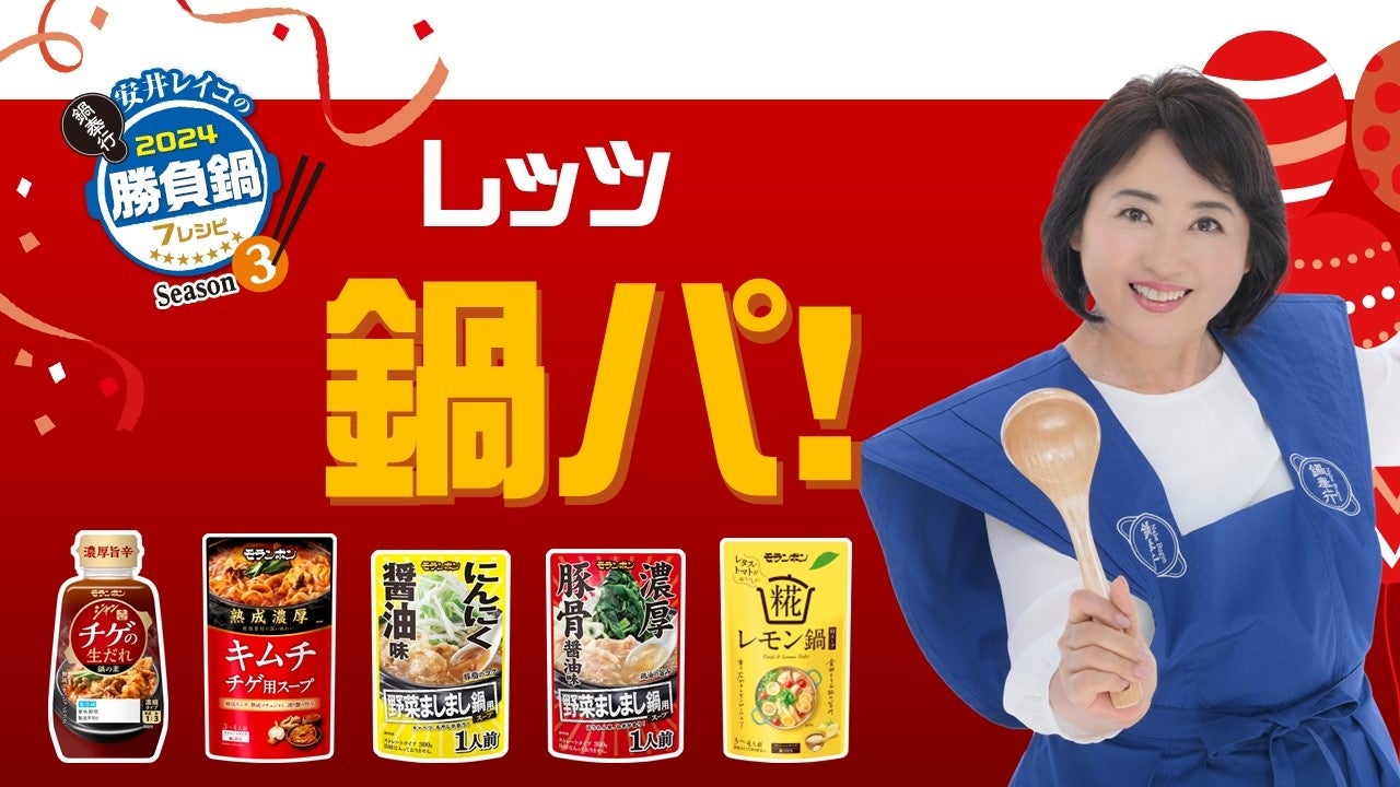 モランボン株式会社(本社:東京都府中市 代表取締役社長:全 峰 碩)は、日本一鍋の素に詳しい料理研究家の安井レイコさんに弊社の鍋用スープを使い、アレンジレシピを考案していただきました。「安井レイコの2024勝負鍋7レシピ Season3」と題し、勝負鍋レシピを9月13日(金)よりスーパーの店頭や弊社ホームページで発信し、ご家族やお仲間との楽しく鍋を囲むきっかけ作りを行いたいと考えます。