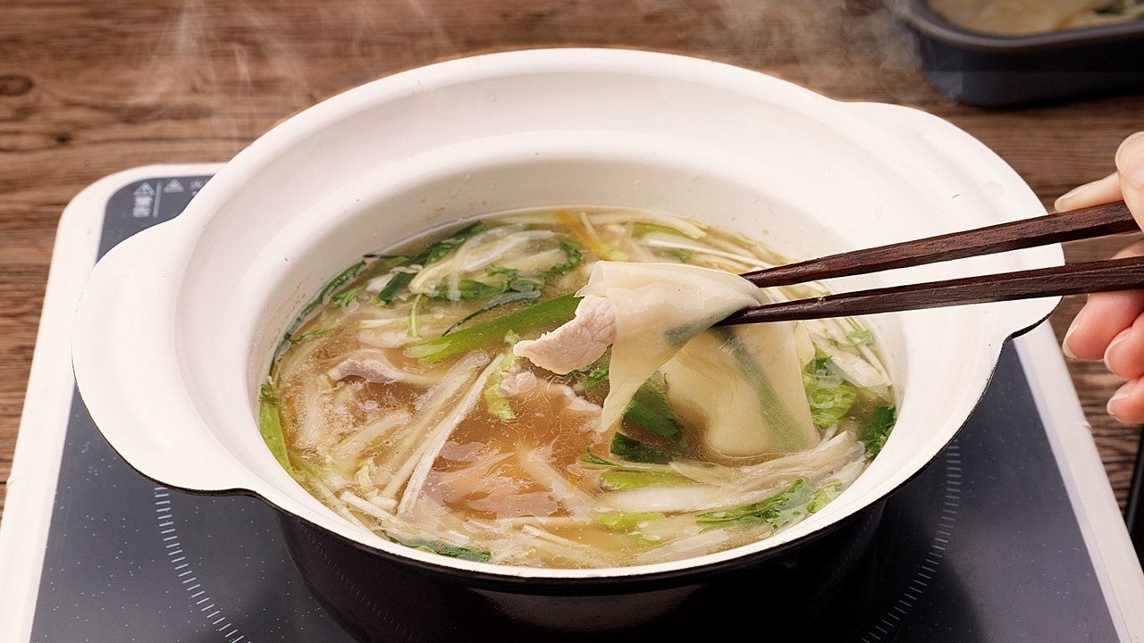 1⼈⽤鍋つゆを使って、おひとり鍋パ! ⾹味野菜や、しゃぶしゃぶ⽤のカット野菜とワンタンの⽪を使って、ワンしゃぶ鍋を作ります。 ワンタンの⽪が〆の代わりに。