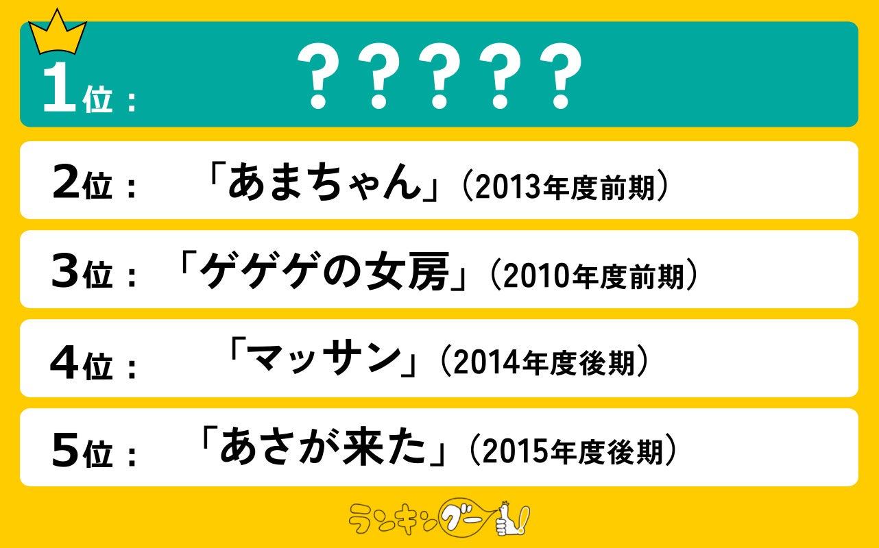 1位はラジオ英語講座と共に歩んだ親子3世代を描いた物語「カムカムエヴリバディ」に決定!2位はヒロインの成長と町の人々との交流を描いた人情喜劇「あまちゃん」。3位は漫画家・水木しげるさんの妻・武良布枝さんのエッセイが原案の物語「ゲゲゲの女房」。4位は日本のウイスキー誕生を支えた竹鶴政孝さんと妻・リタさんをモデルとした物語「マッサン」。そして、僅差で5位にランクインしたのは、日本初の女子大学を設立した、広岡浅子さんをモデルにした物語「あさが来た」でした!