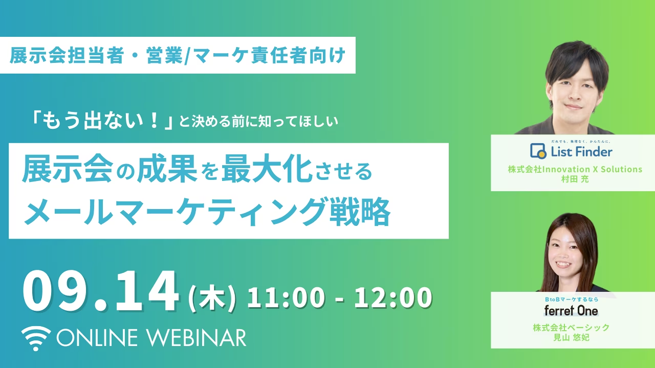 そこで今回、実際に展示会へ出展しており展示会後のフォローにも力を入れている、BtoBマーケティング支援ツール『ferret One』を運営するベーシックと、シンプルな使い心地で誰もが使えるMA『List finder』を運営する株式会社Innovation X Solutionsが、リアルな展示会事情とその後のフォロー方法など、展示会の成果を最大化させるためのメールマーケティングについて解説します。