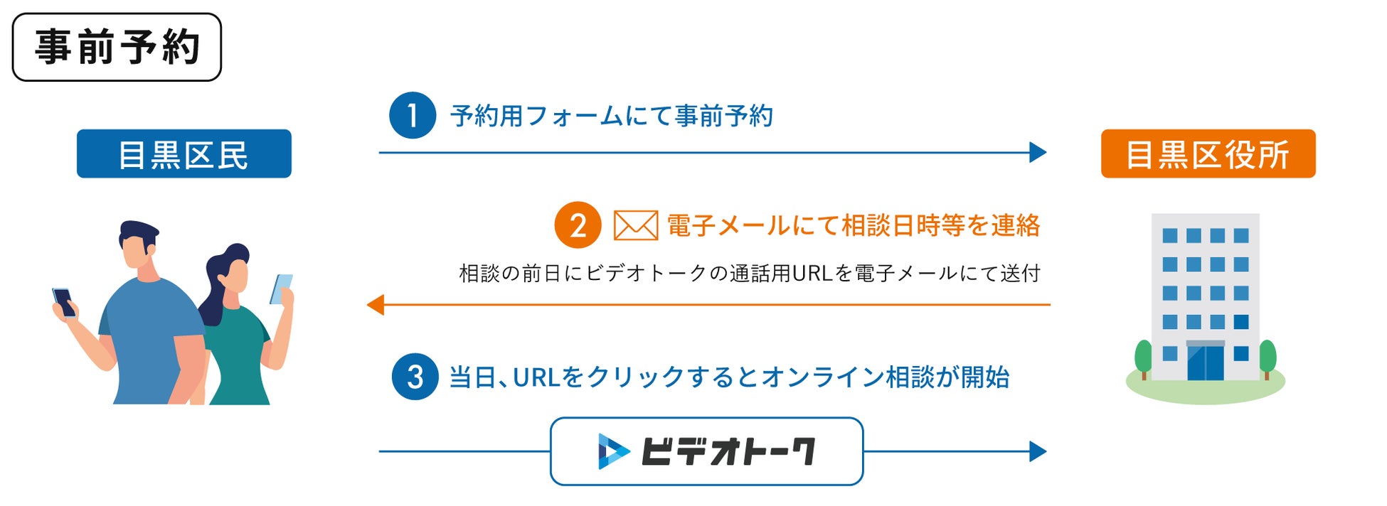 ビデオトークの具体的な利用方法は以下のとおりです。区民側でアプリのインストールやアカウント作成を行う必要がなく、相談時間に電子メールに添付されたURLを1クリックするだけで簡単にビデオ通話を始められます。