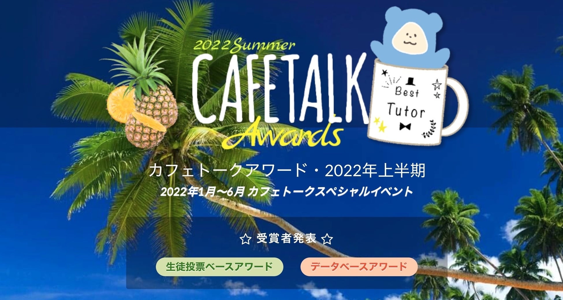 オーストラリア在住、英検対策からお子様英語、大人の英会話レッスンまで幅広い年代から支持を受けるYoshi.先生(プロフィール:https://cafetalk.com/tutor/profile/?c=eJwryS%7EpMAoLdPFIC8krC3PLjEgPC8p0tLUFAG3dCGM.&lang=ja)が大賞を受賞、2021年下半期ではジョイフルレッスン賞を受賞していました。