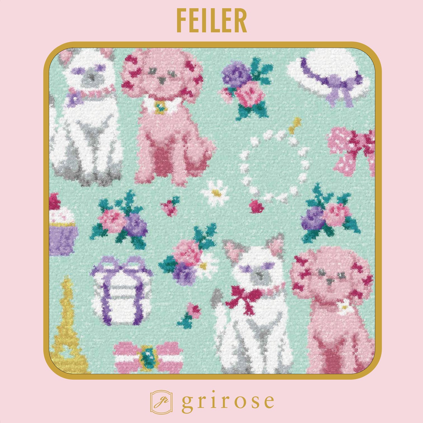 griroseの可愛い仲間、猫のペルルと犬のボンボンが、おめかしをしてパリの街を散策。おませな2匹とおしゃれアイテムを愛らしく織り上げました。「フェイラー」ならではの、緻密なデザインと絶妙なグラデーションによる、立体感のある表情が楽しめるハンカチは、ピンクとパープル、2色の縁取りカラーをご用意しました。