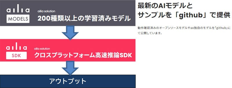 この製品では、弊社が従来から取り扱っているax株式会社製のクロスプラットフォーム高速推論SDKである「ailia SDK」、ならびに200種類以上のAIモデルを取りそろえ最新のAIモデルに対応する「ailia MODELS」などもサポートいたします。