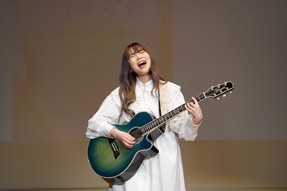その後、野田愛実さんがサプライズで登場。コロナ禍でYouTubeに毎日アップしたカバー動画が総再生回数1000万回超え、カバーされた川谷絵音さんが歌声を大絶賛した、今注目のアーティストです。学生の前でライブを行い、その後「聞き手にどんな気持ちになってほしいか」「自分の強み」など学生の質問にも答えていただきました。学生は、歌声に酔いしれながらも、令和時代の新たなプロモーションの手掛かりを探している様子でした。