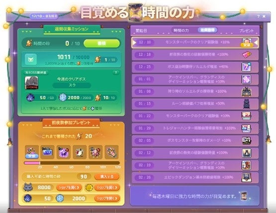 適正モンスター1,000体、もしくは週間ボスモンスターを1人で倒して、「時間の砂」を集めましょう。獲得した「時間の砂」の数に応じて「前夜祭参加プレゼント」を受け取ることができます。また、週間ボスモンスターを1人で倒すと、「時間の痕跡」と「深い時間の痕跡」を追加で獲得でき、専用ショップにて「ソルエルダ」や「カルマプレミアムの書(アクセサリ)チョイスクーポン」などと交換することができます。さらに、週ごとの収集目標を達成していくと、強化された時間の力効果と「前夜祭の熱気球ライディング(無期限)交換券」「黄昏色の前夜祭ダメージスキン(ユニット)」などの目標達成プレゼントを獲得できます。