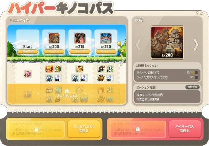 「レベルアップミッション」では、キャラクターが指定レベルに到達するごとに報酬アイテムをプレゼントします。「挑戦ミッション」では、指定ボスを撃破しながら、ミッションで手に入る装備の強化を目指します。ポイントアイテムの「プレミアムキノコパス」、「ハイパーキノコパス」を購入すれば、両方のミッションでより豪華な報酬が獲得できます。