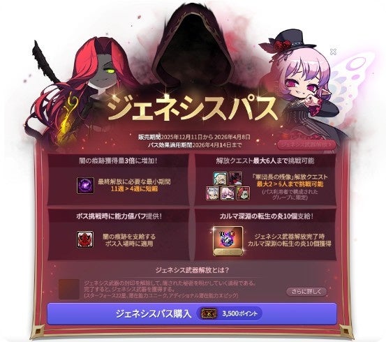 強力な「ジェネシス武器」の解放をサポートする「ジェネシスパス」を販売します。武器解放のハードルが下がる様々な特典で、この機会に「ジェネシス武器」を解放しましょう!