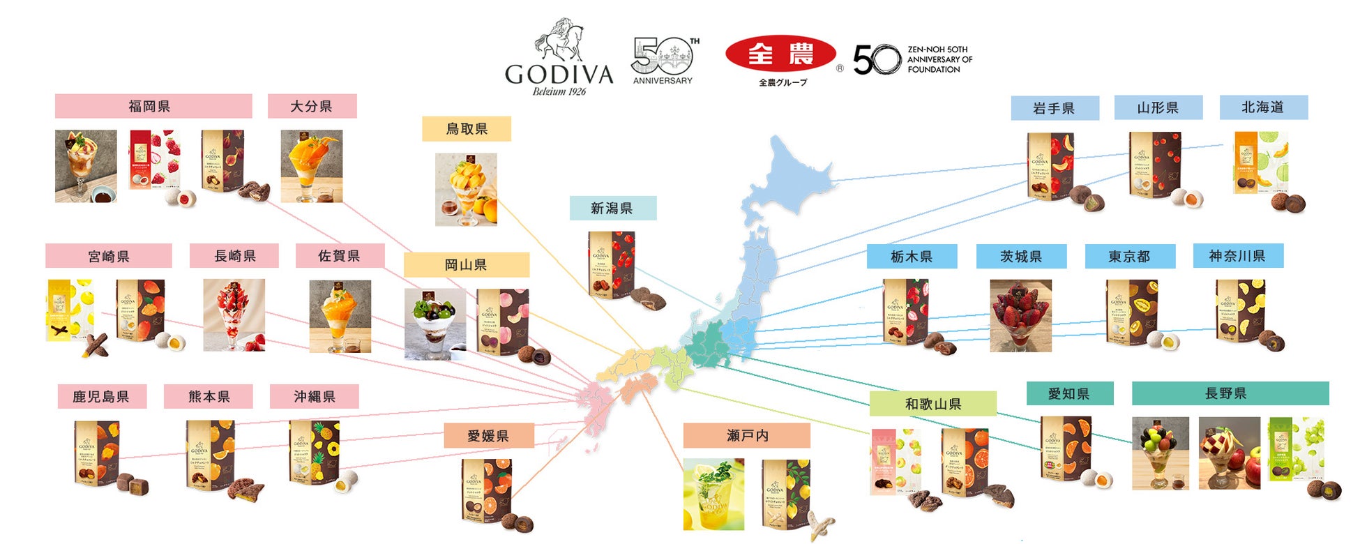 共に50周年を迎えた両者は、日本の食を支えるすべての生産者の皆さまを応援し、商品を通じて日本各地の食材を全国の沢山の方に届けたいという想いとともに、「GODIVA×全農 コラボレーションプロジェクト」を発足し、1年を通して全50種類のコラボレーション商品を展開しました。