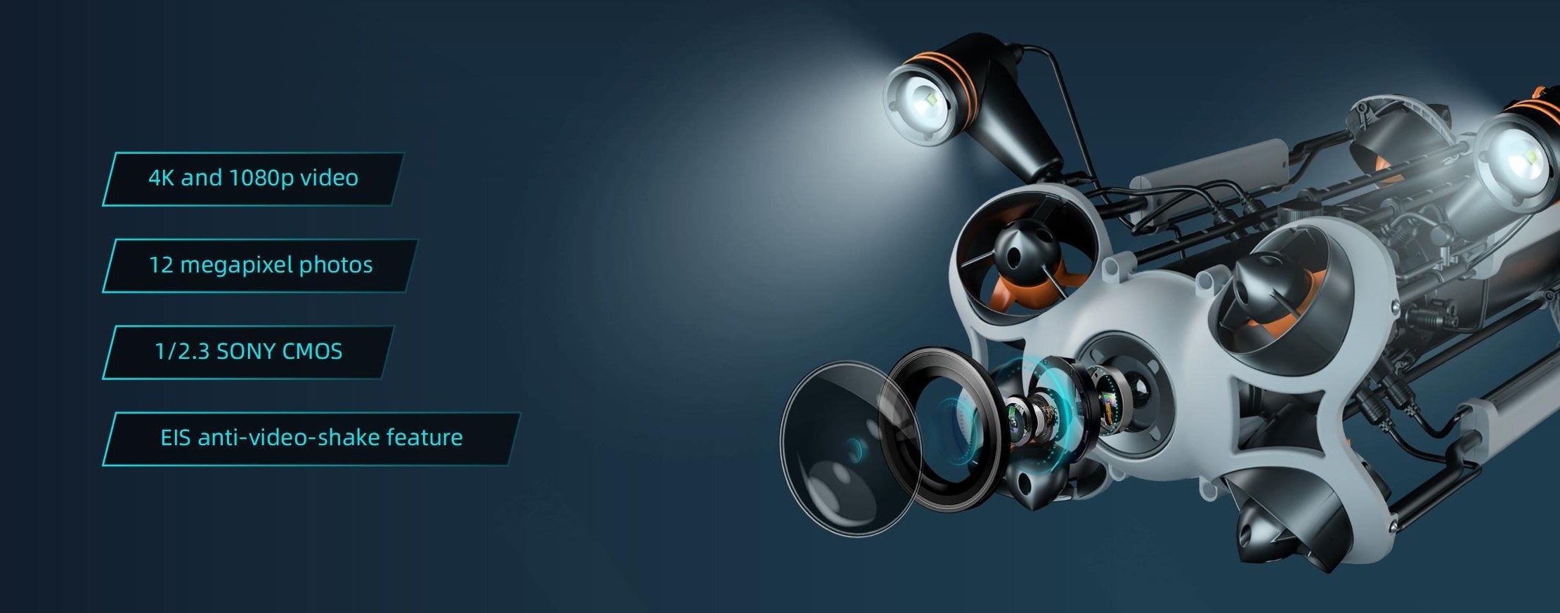 4Kビデオと12MP画像が撮影可能な、1/2.3 SONY CMOS と電子ブレ補正(EIS)を搭載しており、水中のあらゆる対象物の詳細が撮影できます。