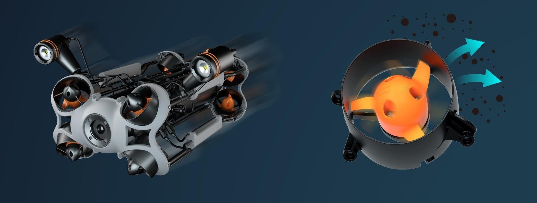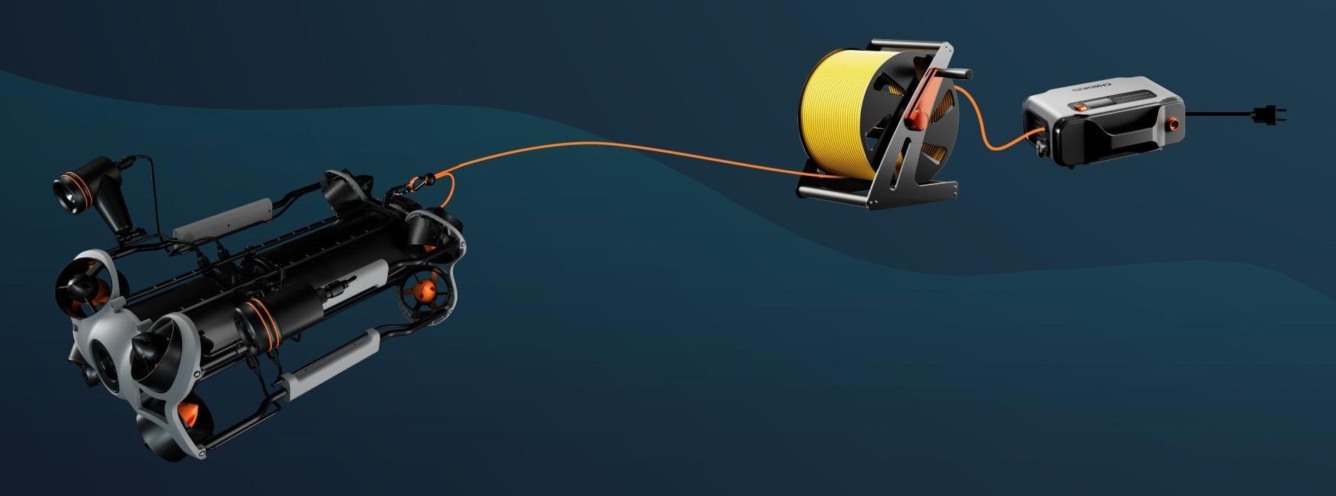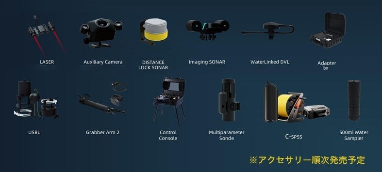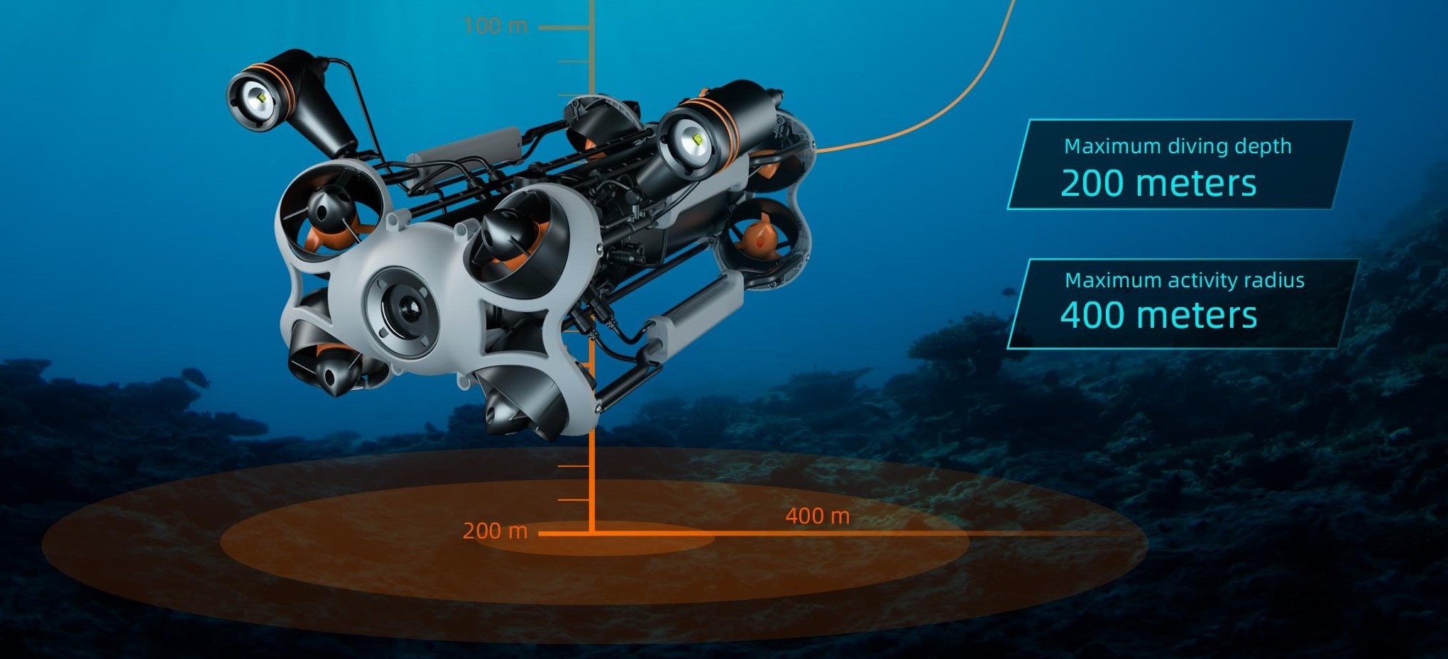 稼働半径400m、深度200mまで潜航し360°自在に移動・撮影可能で、合計8000ルーメンの外付けライトと20種類以上のアクセサリーに対応した5つのポートを搭載するシリーズ最上位の水中ドローンです。