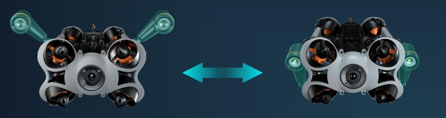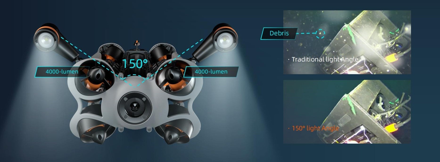機体の外側に付いた2つのLEDフィルライトは合計8000ルーメンの光量と150°の照射角により、浮遊物の反射や映り込みによるノイズを解消します。明るさを0〜100%の範囲で無段階に調整できるため、状況に応じて対象をを照らすことが可能です。あらかじめ折りたたんで使用することも可能なので、水中での様々な作業環境に対応します。