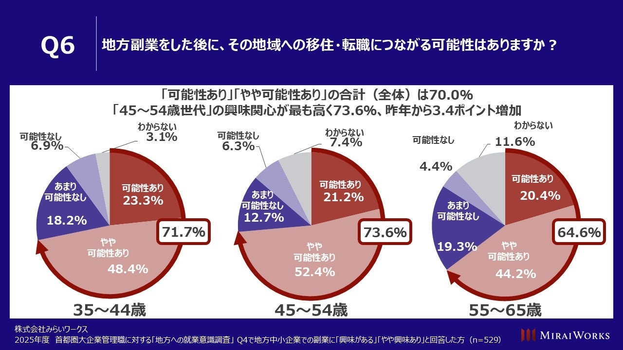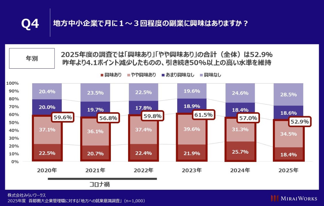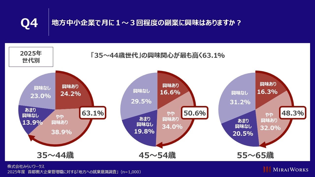 また、地方中小企業での副業に興味がある人(月に1~3回程度)も52.9%と、昨年度より4.1ポイント減少したものの、引き続き半数以上の高い水準を維持しています。地方副業においても「35~44歳世代」の興味関心が最も高く63.1%でした。