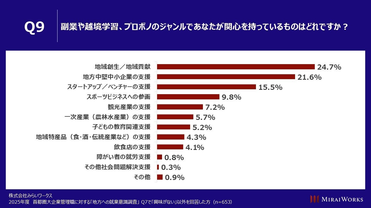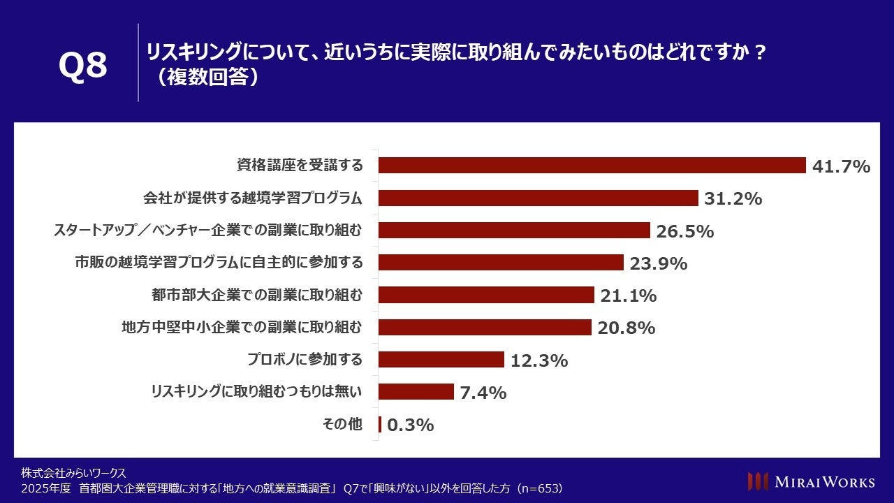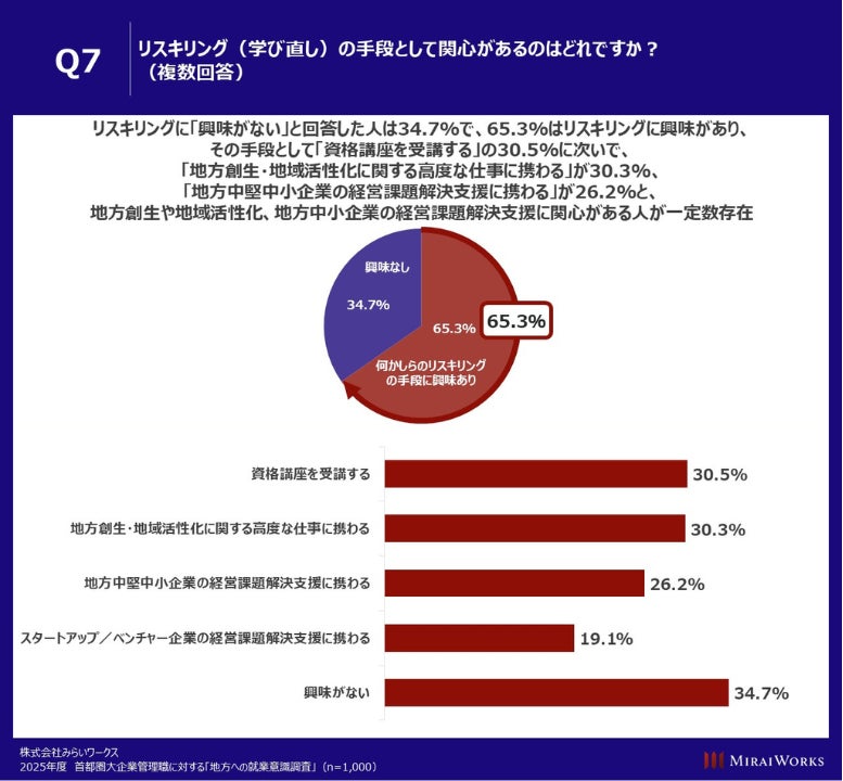 さらに、リスキリング(学び直し)に関心がある人は65.3%に上り、その手段として「地方創生・地域活性化に関する高度な仕事に携わる」(30.3%)や「地方中堅中小企業の経営課題解決支援に携わる」(26.2%)といった、地方の課題解決への関心が高いことが明らかになりました。