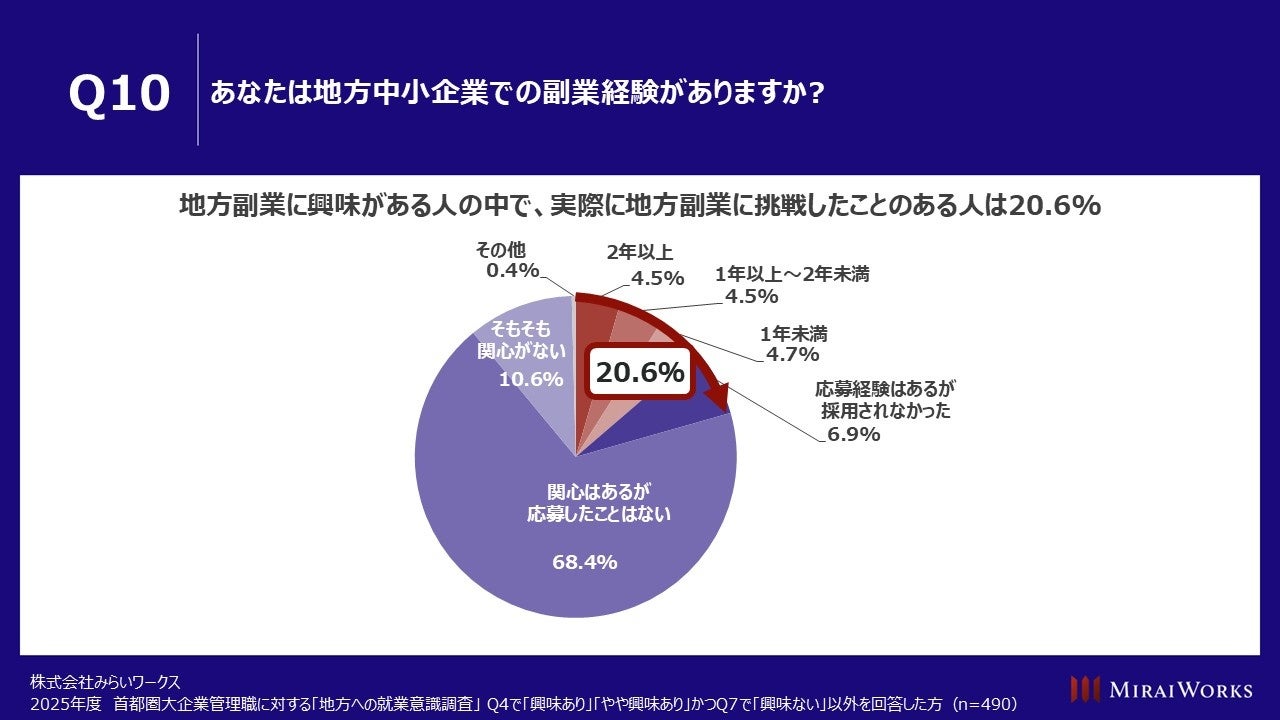 また、地方での副業を経験後にその地域への移住・転職につながる可能性があると答えた人は70.0%と高い水準であり、特に「45~54歳世代」では73.6%と最も高い関心を示しました。このことから、地方副業が地方転職・移住のきっかけとなり得ることが示唆されます。しかしながら、地方副業に興味がある人のうち、実際に地方副業に挑戦したことのある人は20.6%にとどまっており、興味と行動の間に依然としてギャップがある現状です。