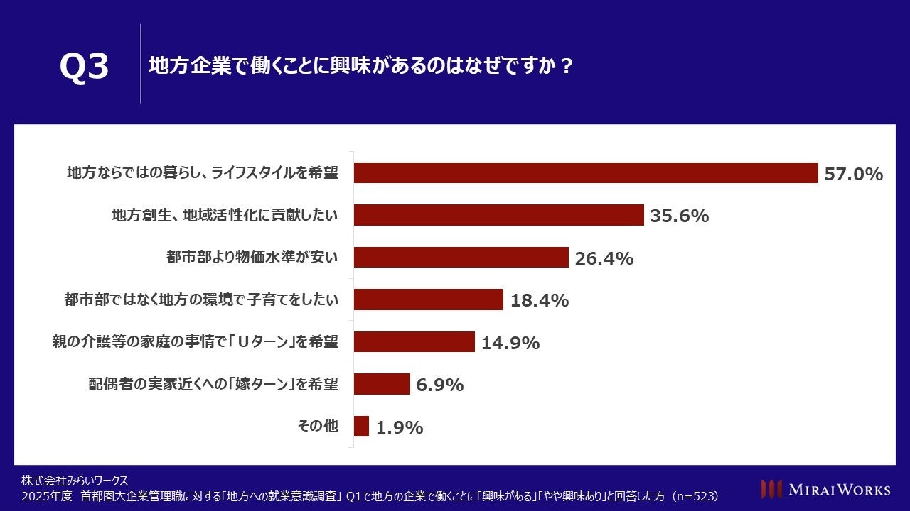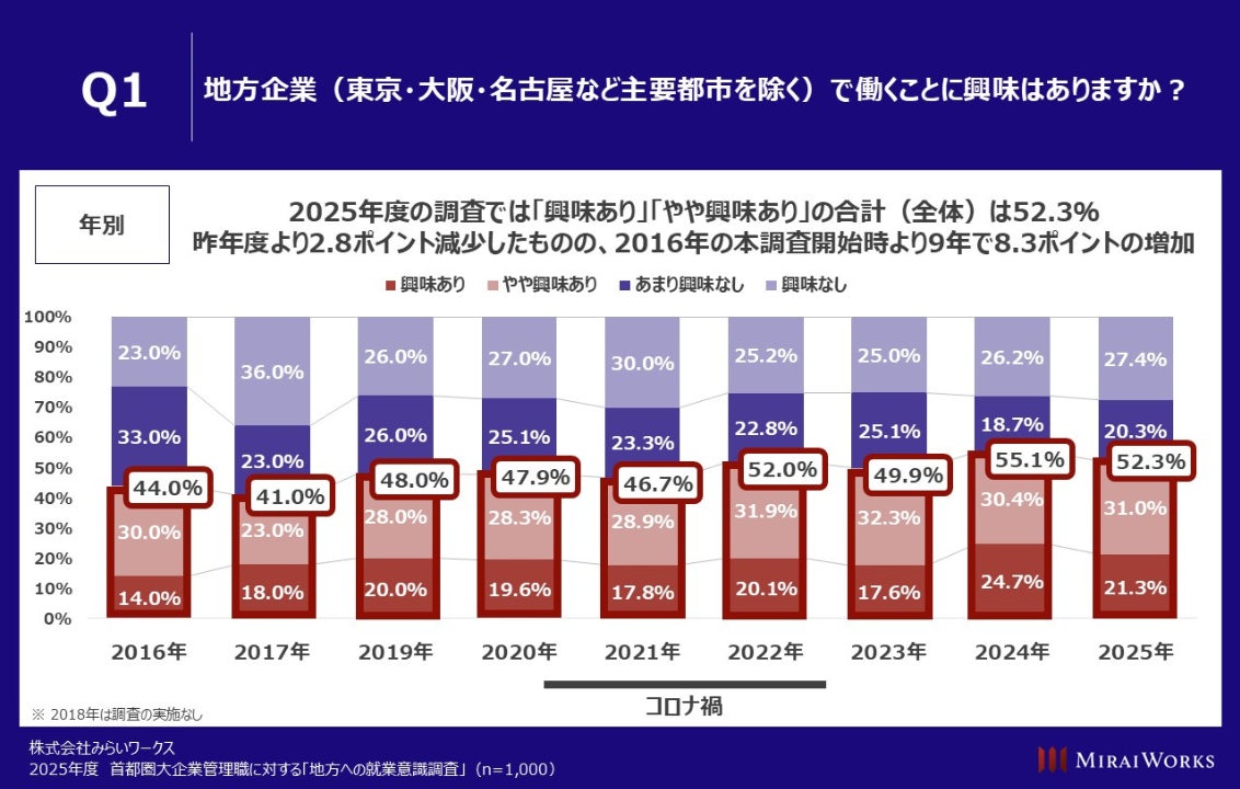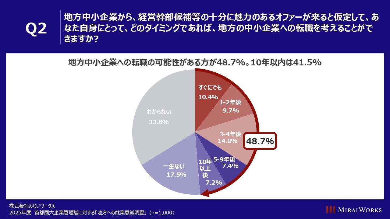 株式会社みらいワークス(本社:東京都港区、代表取締役社長 岡本 祥治、以下「当社」)は、首都圏の大企業に勤める管理職1,000名に対する「地方への就業意識調査」を実施しましたので、お知らせいたします。