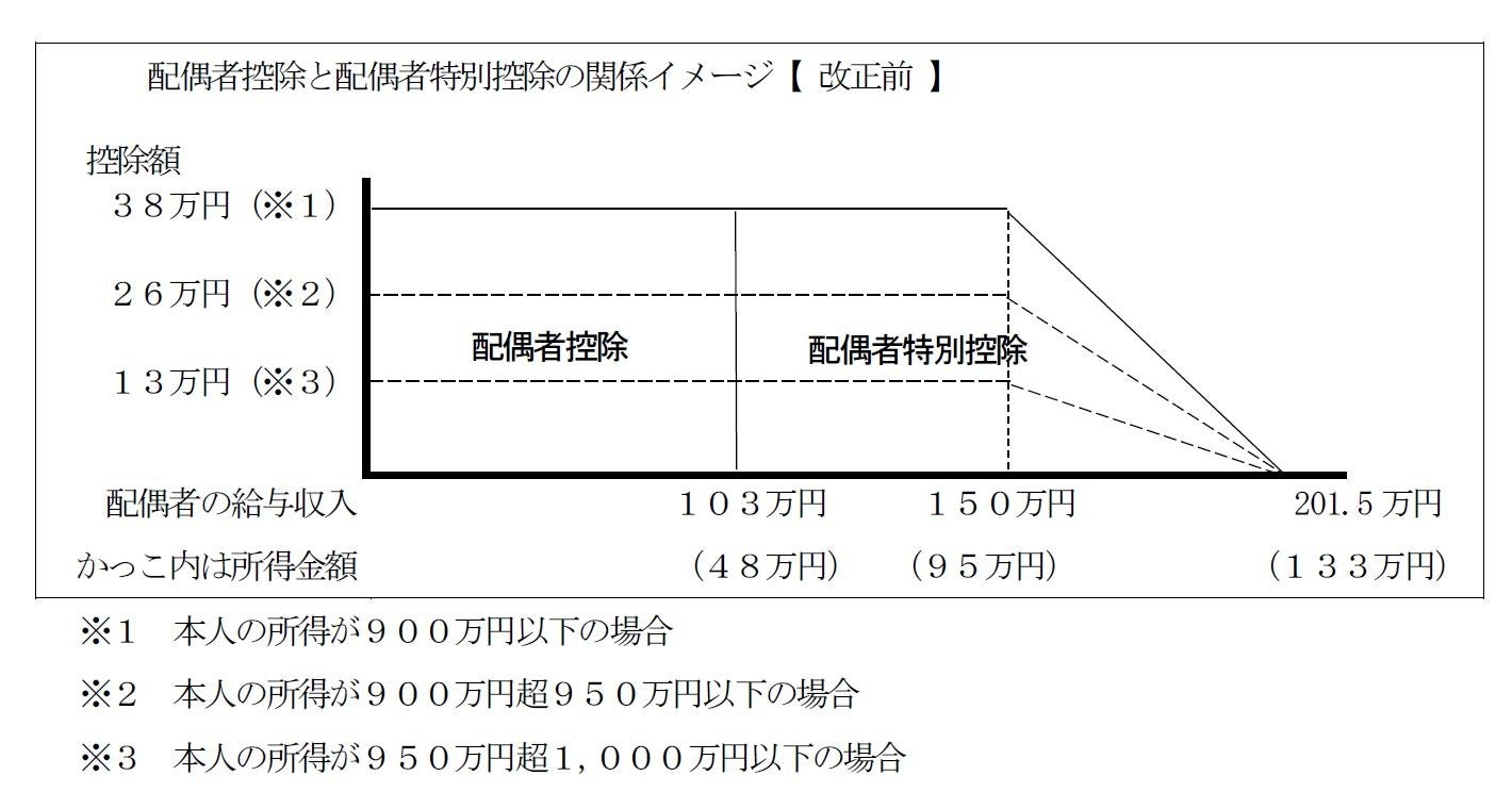 103万円の壁とは、配偶者や扶養親族の給与収入が103万円を超えると配偶者控除や扶養控除が適用できなくなるために、給与収入を103万円以内に抑えるための就業調整を行うことを言いますが、配偶者については、給与収入の額が103万円を超えても、配偶者控除に代えて配偶者特別控除が適用され、給与収入が150万円までは配偶者控除と同額の控除を受けることができ、150万円を超えても控除額が徐々に逓減していくような制度が設けられています。