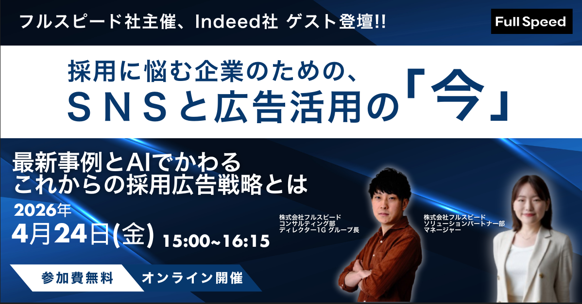 【4月24日(金)開催】フルスピード社主催 Indeed社 ゲスト登壇 採用に悩む企業のための、SNSと広告活用の「今」― 成功事例とAIで変わる、これからの採用広告戦略 ―