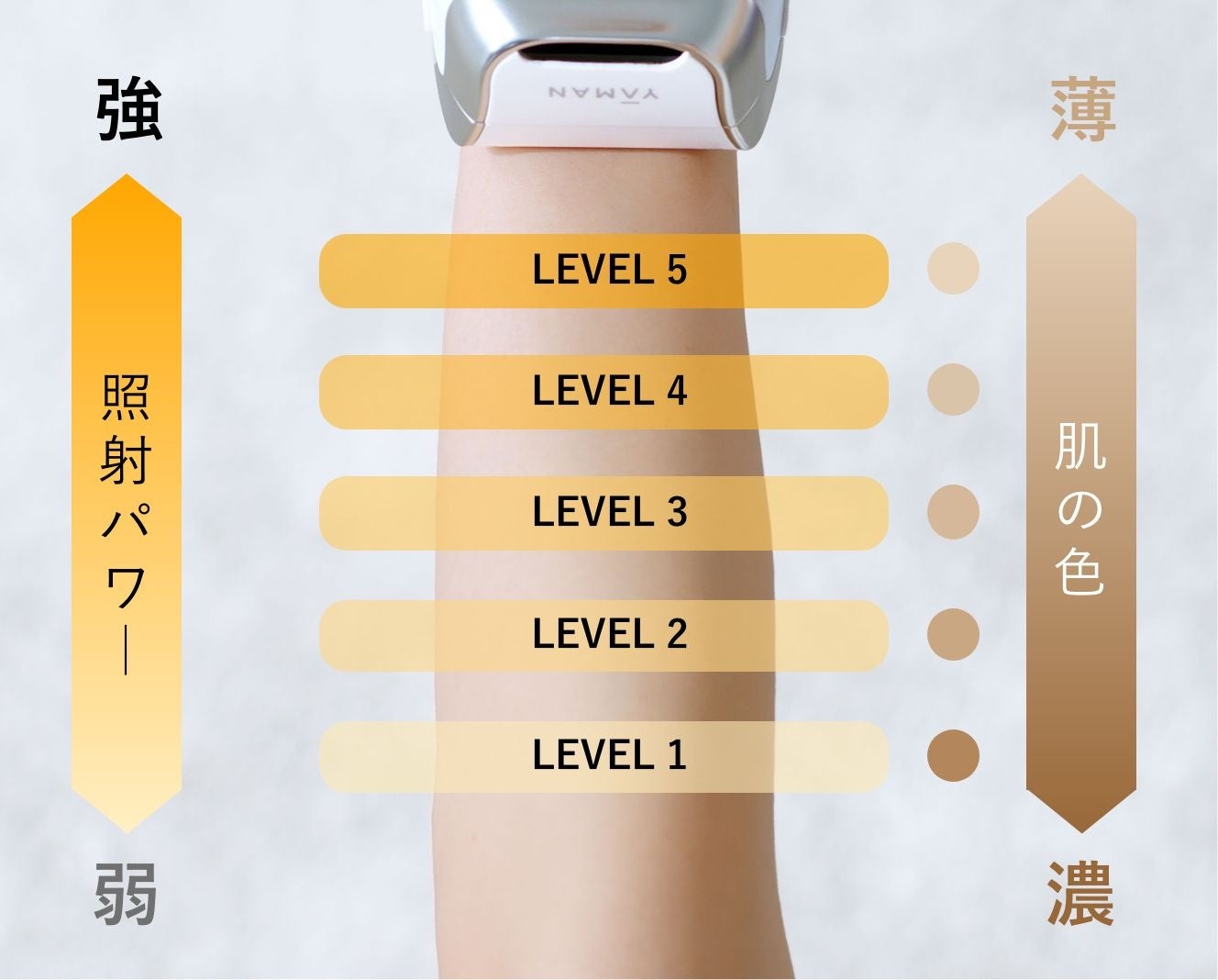 また1~5までの最適なレベルを自動で調整するスキンセンサーも搭載。(ご自身で選択することも可能です。)初めて使う方は、お肌の色味に応じ適したレベルを提案してくれるため、自動調整モード(オートレベル)でのお手入れがおすすめです。
