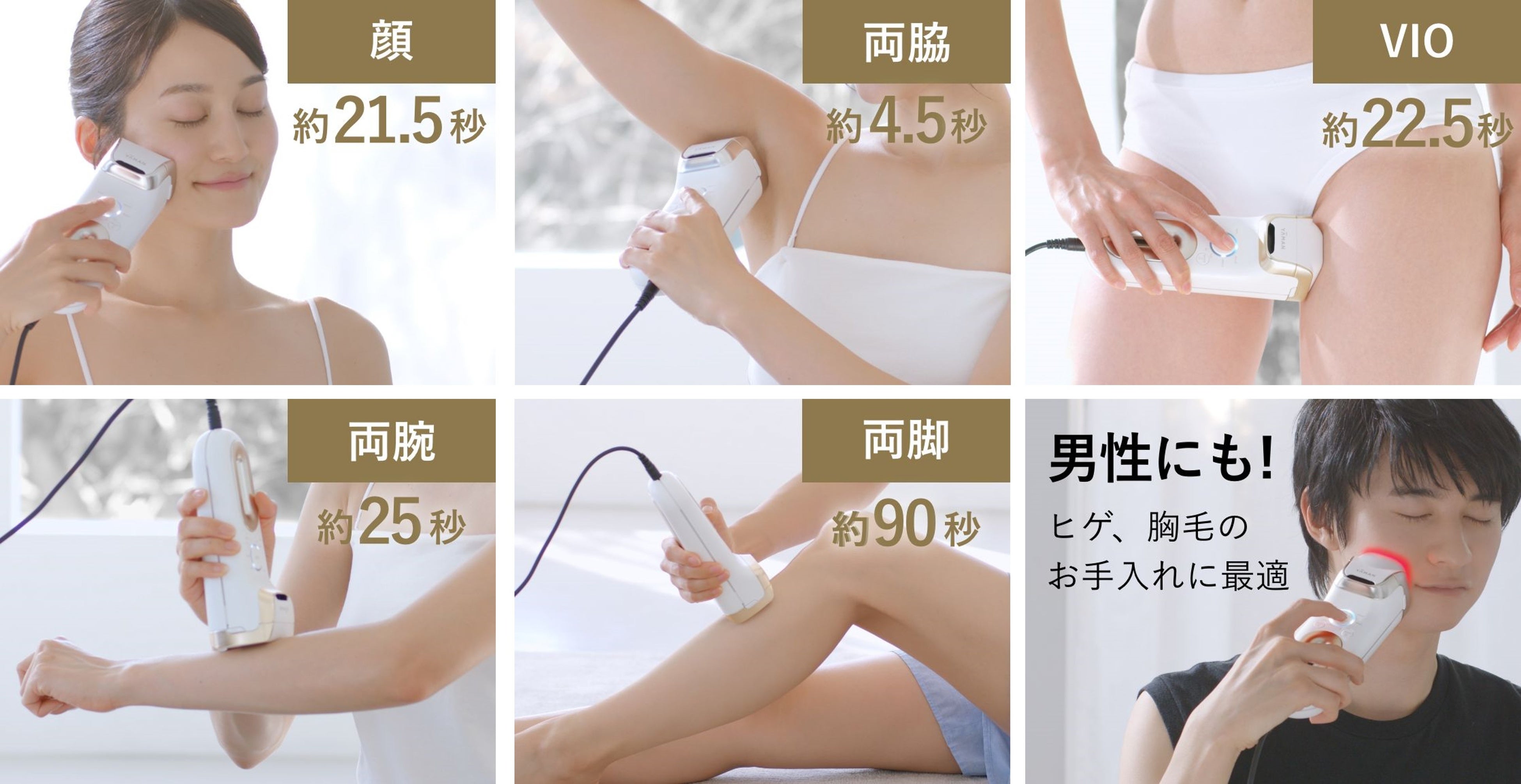 *5 ケア部位:フェイス・両脇・両足両腕・両手指両足指・へそ下・ビキニライン・VIOライン/各モードレベル1 使用時 個人差があります