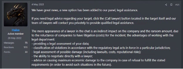 第2四半期にはQilinも、標的に対する圧力を増大させ、身代金を最大化するための新手の恐喝ツールやサービスを展開する主要なアクターとして台頭しました。窃取したデータの確認、標的の法域における規則違反の可能性の検討、税務機関・警察といった関連当局やFBIをはじめとする取り締まり機関に提出する書類作成の際に法的支援を提供するサービスなどがあります。