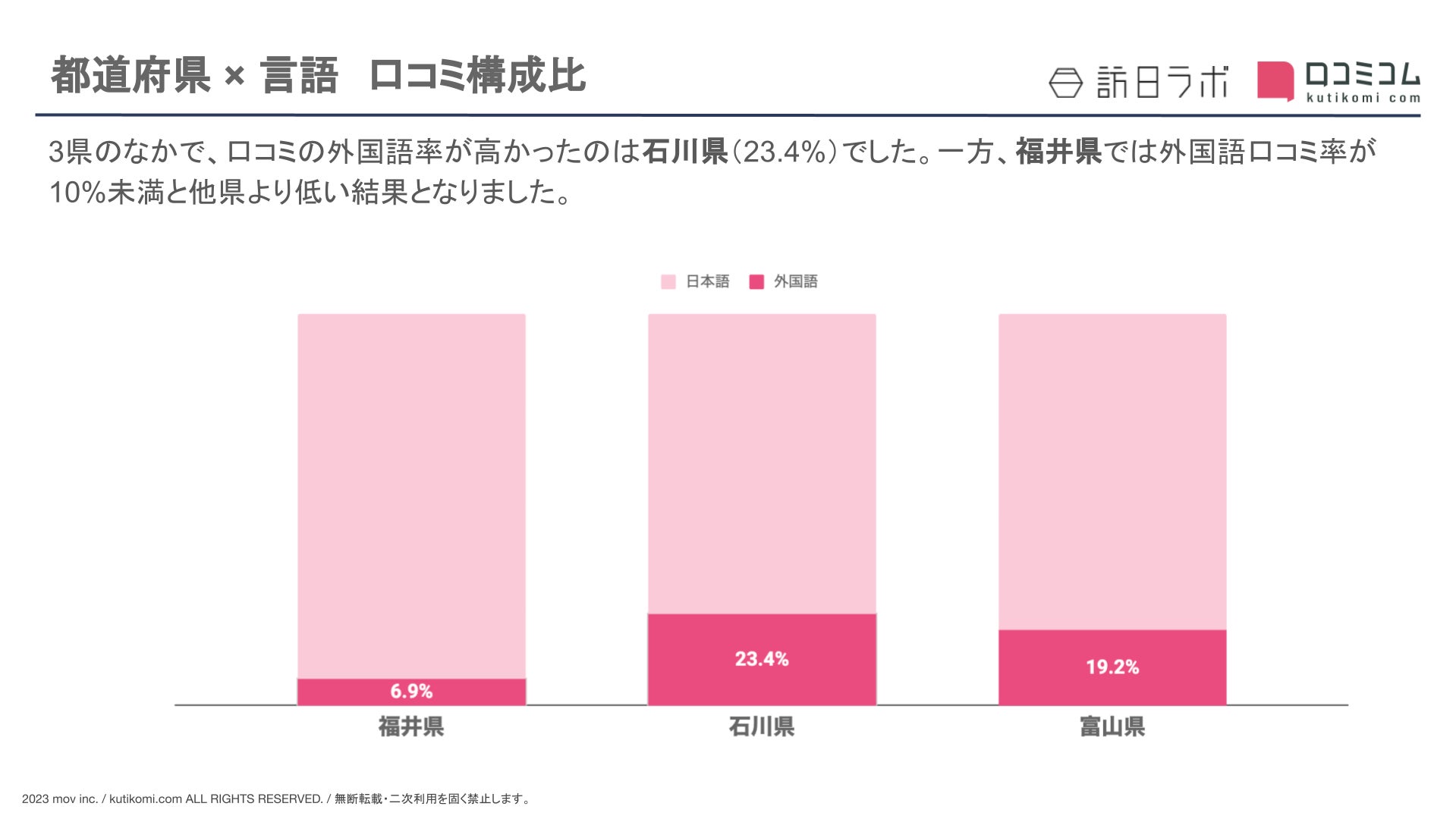 3県のなかで、口コミの外国語率が高かったのは石川県(23.4%)でした。一方、福井県は外国語口コミ率が10%以下と他県より低い結果となりました。